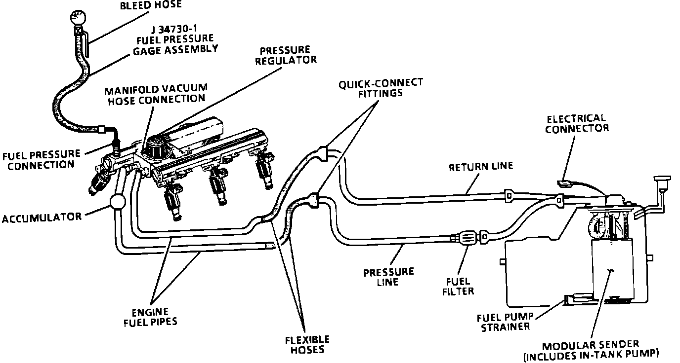 2. Restricting the the fuel return line allows fuel pressure to build above regulated pressure. With battery voltage applied to the pump test terminal, pressure should rise above 325 kPa (47 psi) as the return hose is gradually pinched.