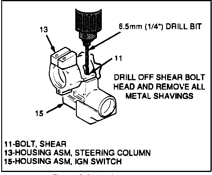 16. Shear bolts (11), shear bolt washers (12) and lock cylinder housing (15) from column housing (13) as follows: