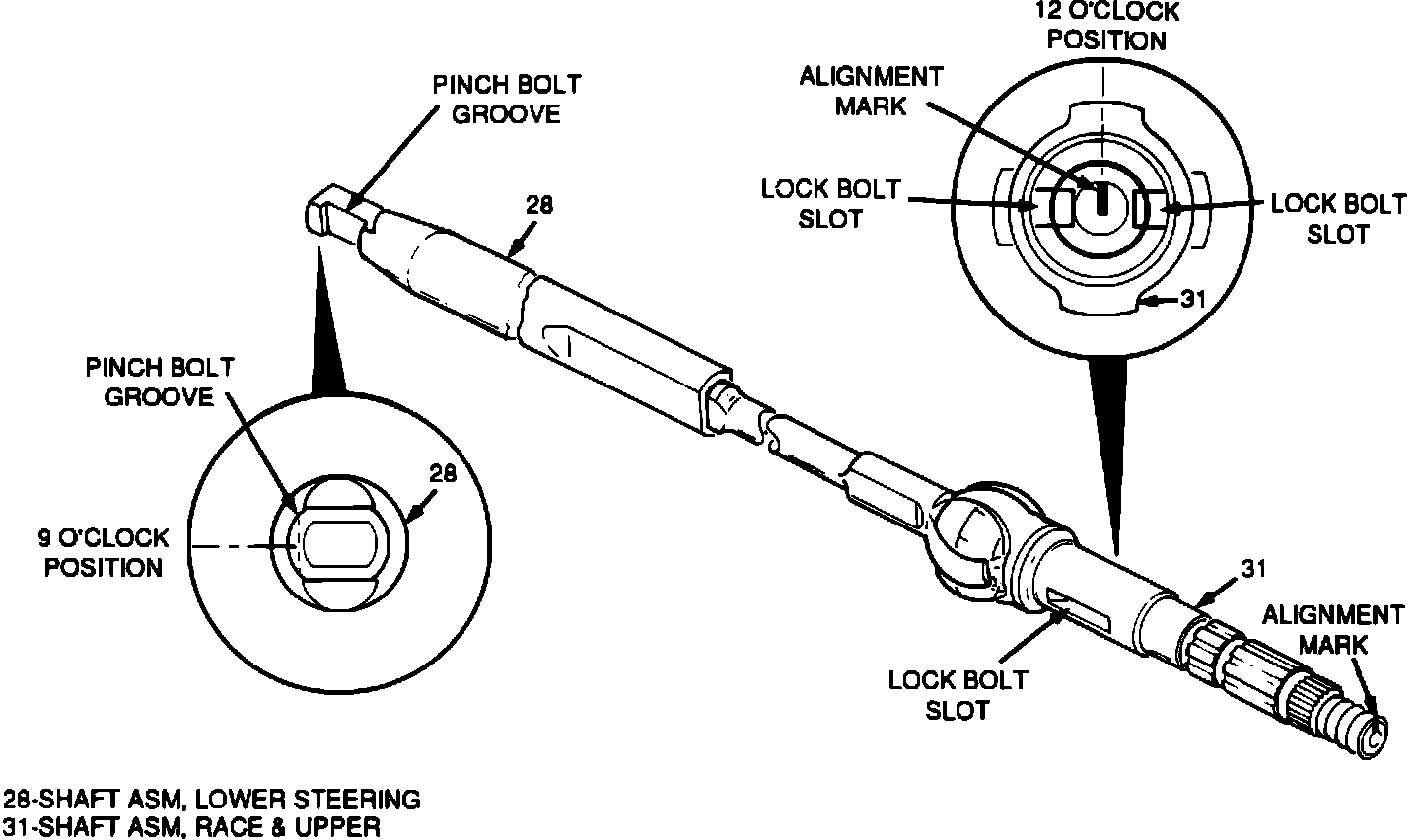 Important: Prior to separation of upper shaft (31) and lower shaft (28) note relationship of upper shaft with alignment mark in threaded end at 12 o'clock position and lower shaft pinch bolt groove at 9 o'clock position. Refer to this orientation for proper reassembly.