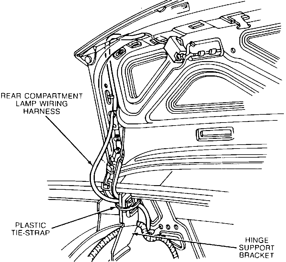 Remove the tie-strap from the rear compartment lid hinge support bracket and repair the rear compartment lamp wire following the electrical repair procedures in Section 8A of the Service Manual. Once the repair is made, reroute the rear compartment lamp wiring by placing the excess wire in the rear compartment lid above the hinge.