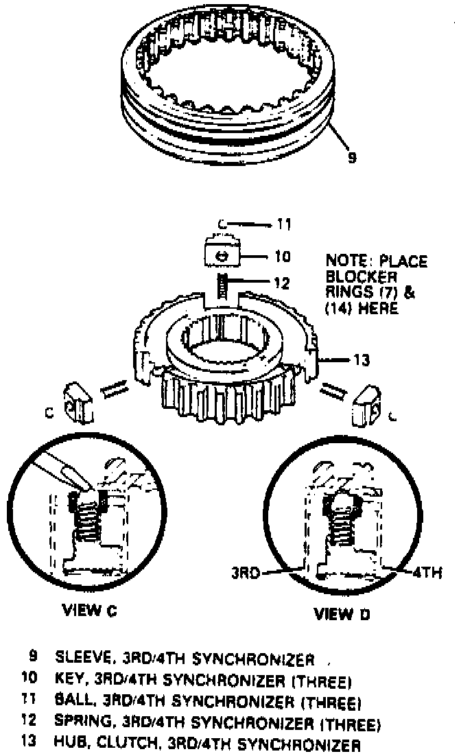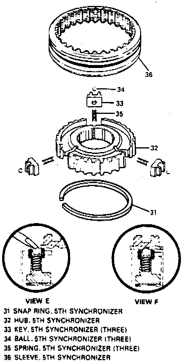 10. On all synchronizers except reverse, center hub, keys and balls by pushing on both blocker rings (views B, D and F). Balls will click into position.