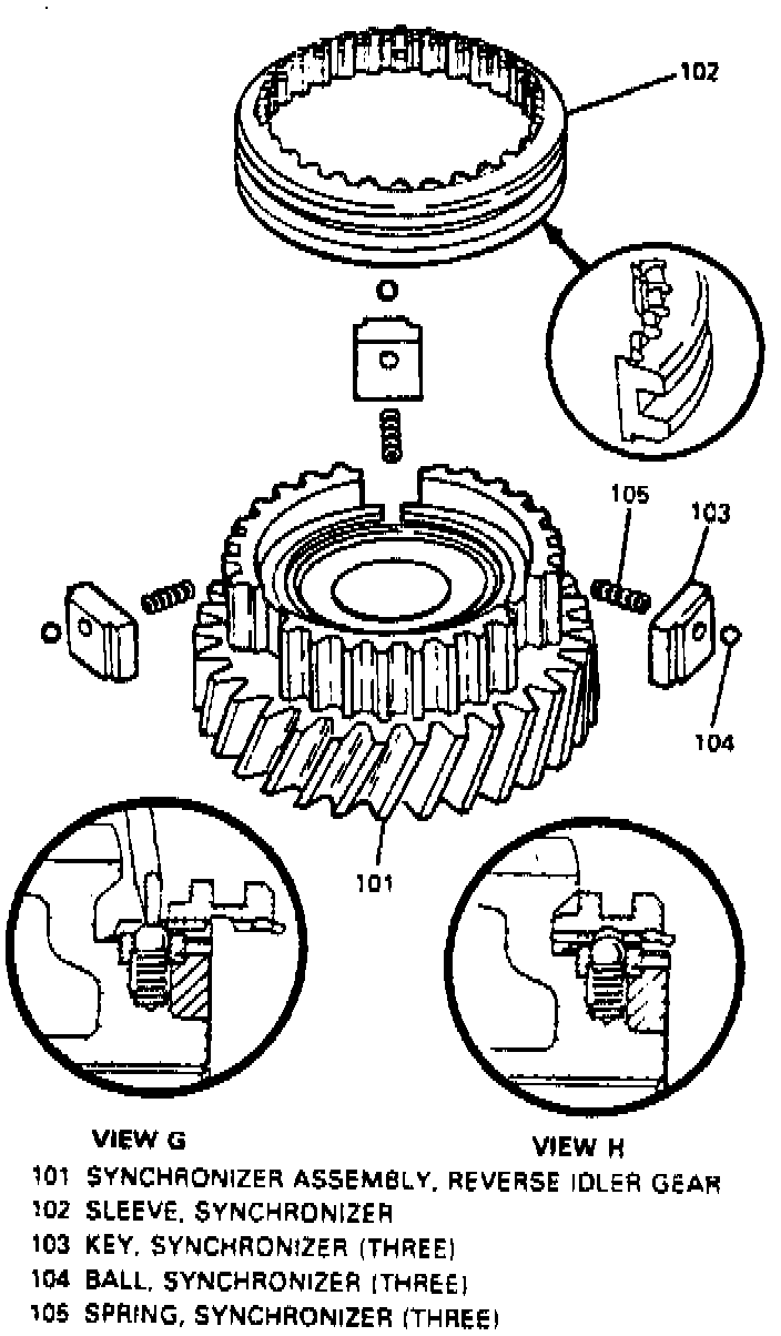 9. On reverse synchronizer, center hub, keys and balls by pushing blocker ring (view H). Balls will click into position.