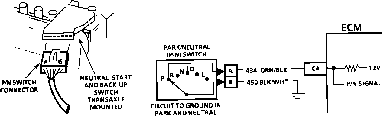 The PARK/NEUTRAL switch contacts are closed to ground in park or neutral and open in drive ranges. The ECM supplies ignition voltage through a current limiting resistor to circuit 434, and senses a closed switch when the voltage on circuit 434 drops to less than one volt. The ECM uses the P/N signal as one of the inputs to control idle air and vehicle speed sensor diagnostics.