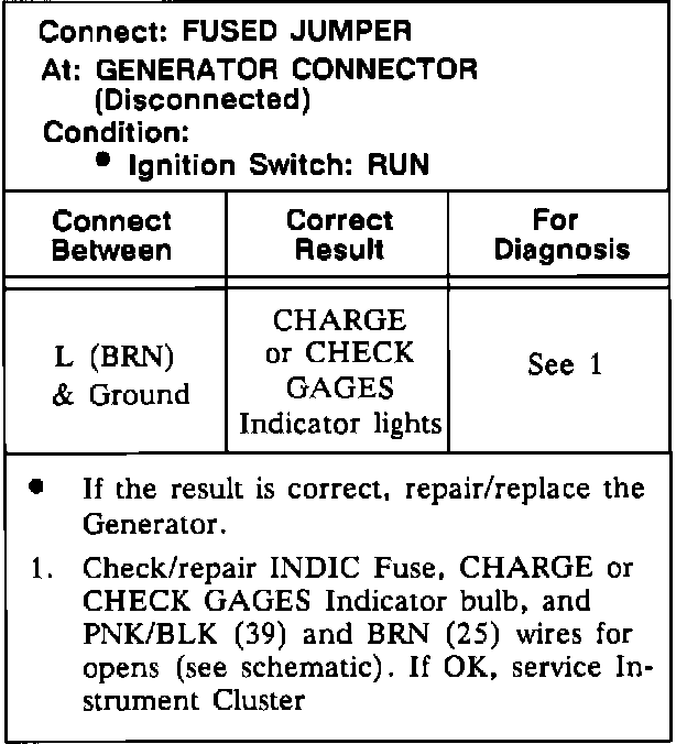 Charge Or Check Gages Indicator Does Not Light With The Ignition Switch In RUN And The Engine Stopped: