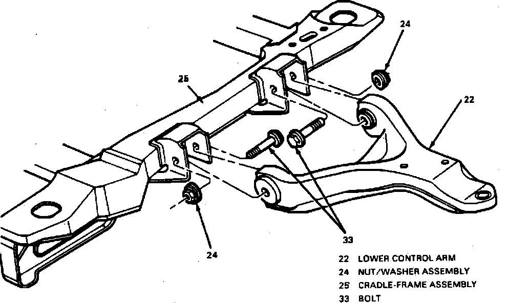5. Remove lower control arm to frame attaching nuts and bolts, then the lower control arms.