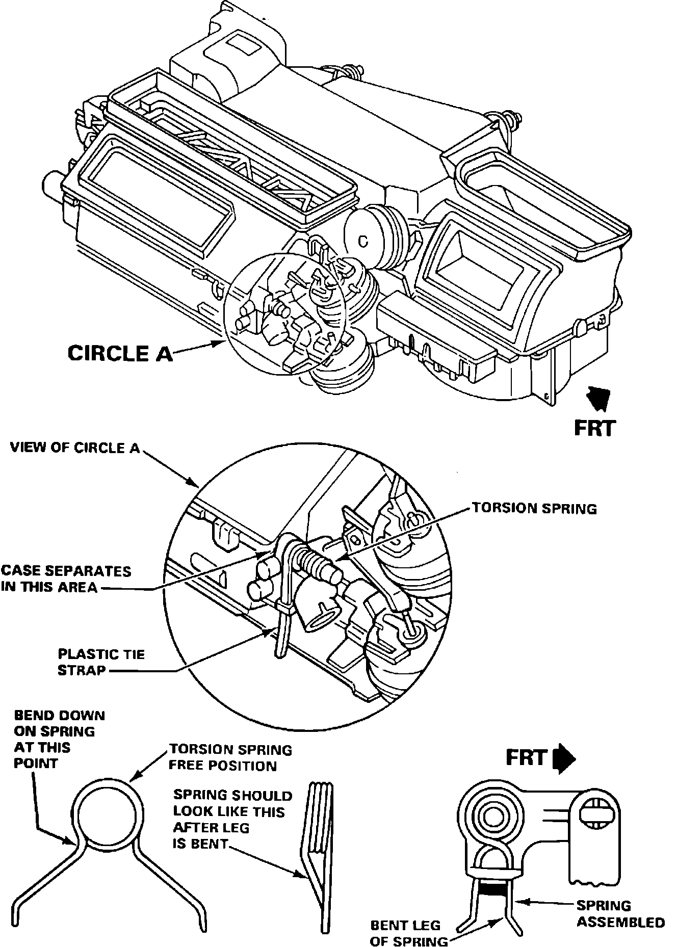 The defroster valve door may not return to the mid-position (blend). The Heater A/C module upper cover separates from the lower case, causing the torsion spring on the end of the valve door shaft to slip off the end of the shaft, or the torsion spring may slip off the shaft on its own without the case and cover separating.