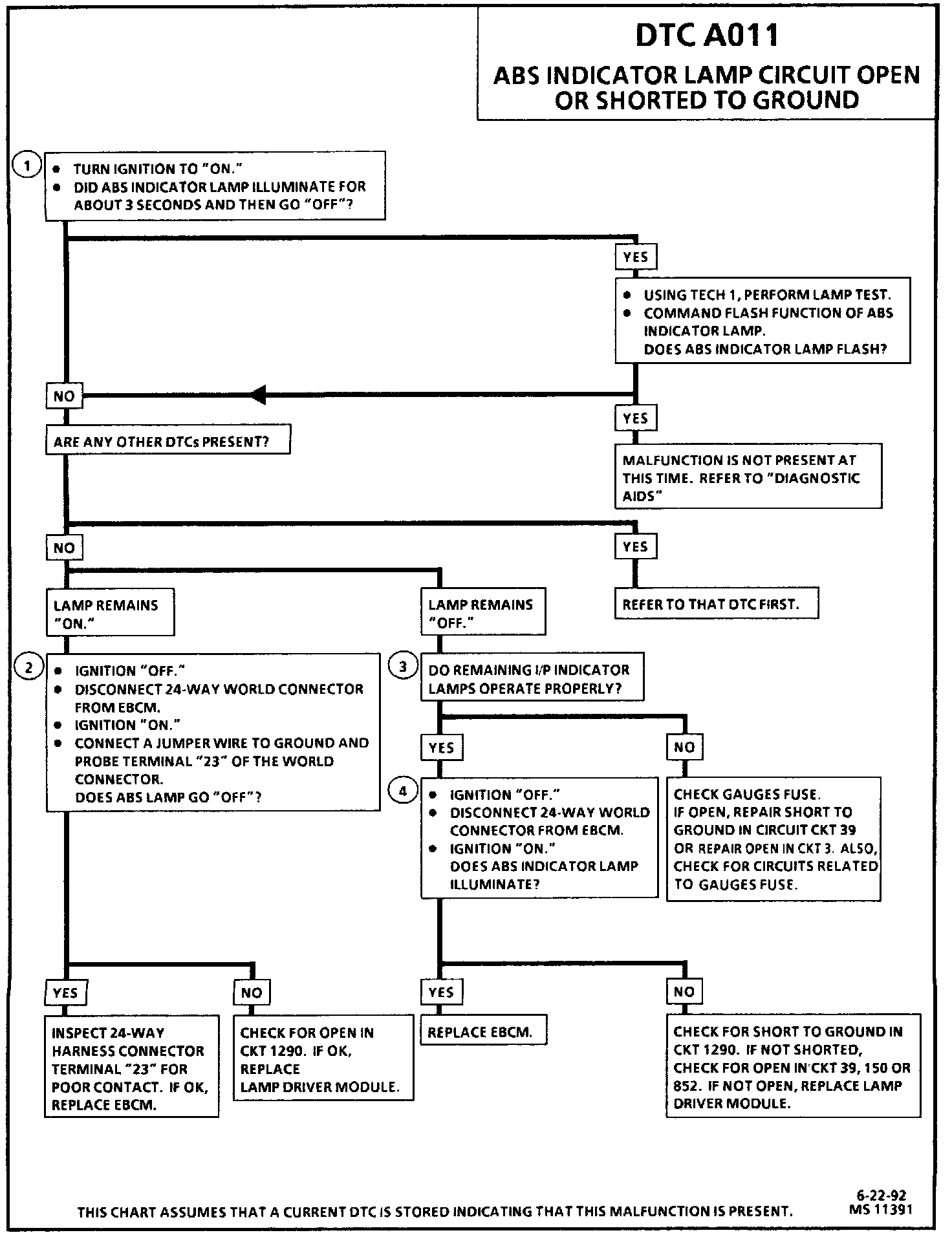 DTC A011 can be set only during the three second bulb check or when the ABS indicator lamp is commanded "ON." If the EBCM can not control the ABS indicator lamp for two seconds, a malfunction exists.