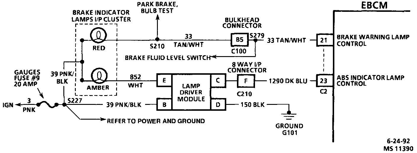 This test checks the state of the ABS indicator tamp to identify a situation in which the driver could not be warned of a system malfunction by the ABS indicator lamp. The Lamp Driver Module (LDM) turns the ABS indicator lamp "ON," unless the EBCM provides ground to turn it "OFF." Because of the circuitry internal to the LDM, only external malfunctions can be detected. As a result, the ABS indicator lamp itself is not diagnosable, only the control line to the EBCM can be diagnosed.