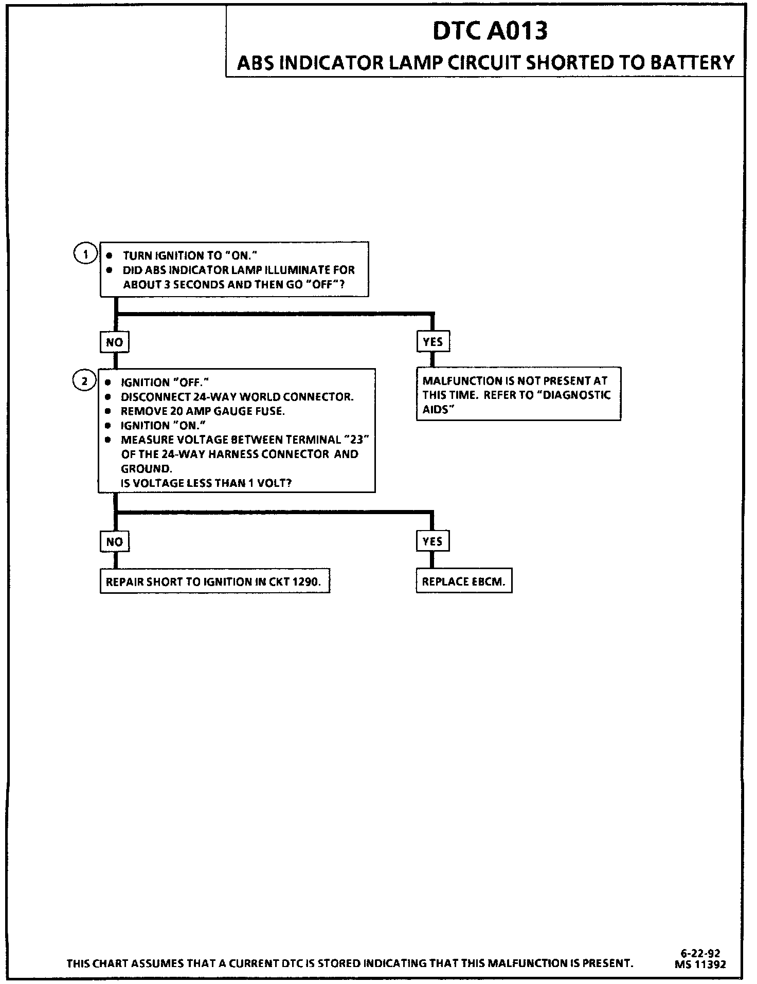 DTC A013 can be set anytime the EBCM commands the ABS indicator lamp "OFF." If the EBCM can not control the ABS indicator lamp for two seconds, a malfunction exists.
