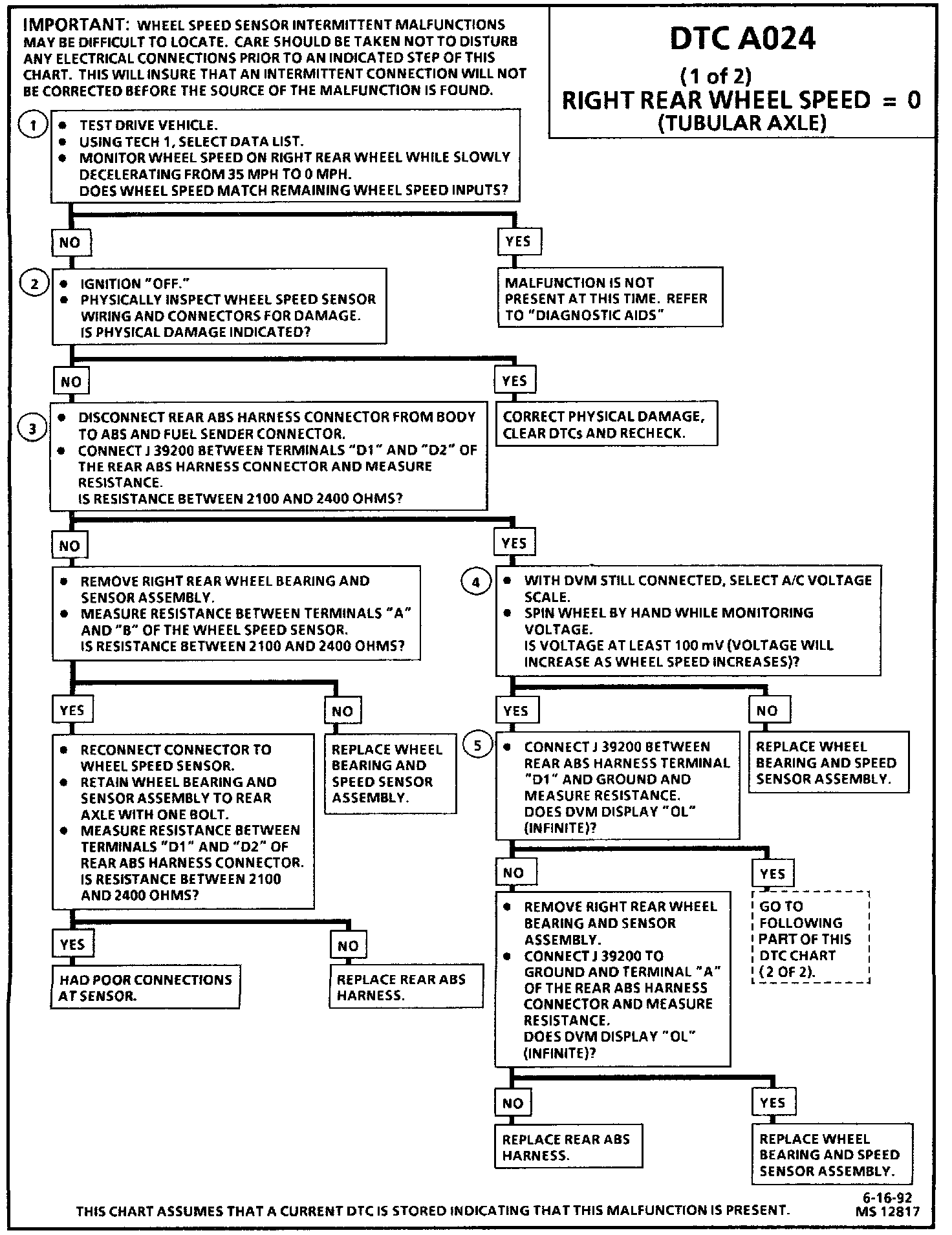 DTC A024 can be set when the vehicle is not in an ABS stop. If the right rear wheel speed is less than 1/2 of the vehicle's reference speed and the vehicle's reference speed is greater than 8 km/h (5 mph), a malfunction exists.