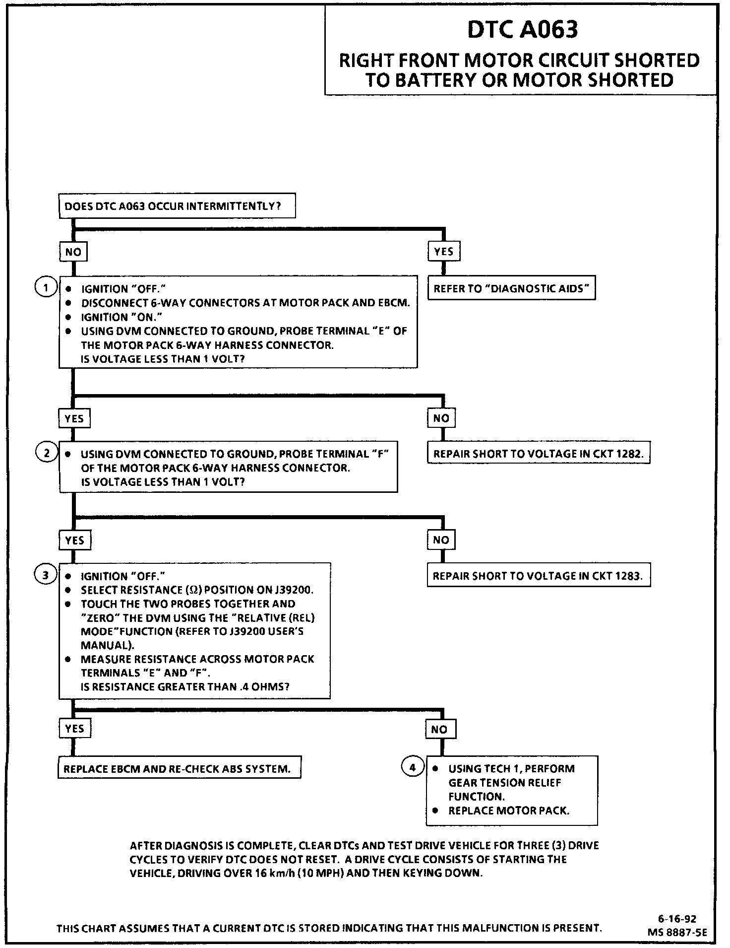DTC A063 can be set anytime. If the EBCM detects an out of range voltage in either of the right front motor circuits indicating a circuit shorted to battery or a motor shorted, a malfunction exists.