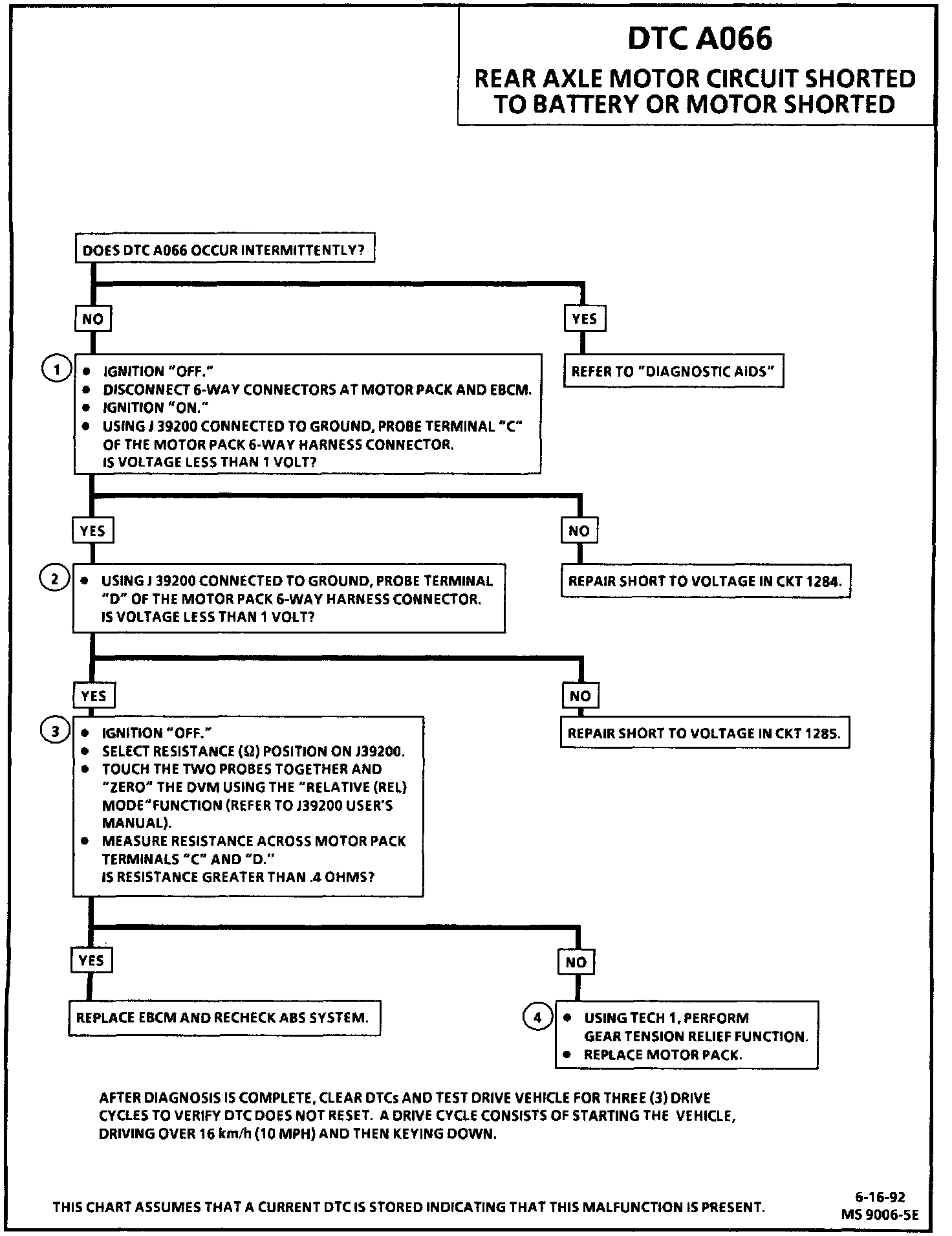 DTC A066 can be set anytime. If the EBCM detects an out of range voltage in either of the rear axle motor circuits indicating a circuit shorted to battery or a motor shorted, a malfunction exists.