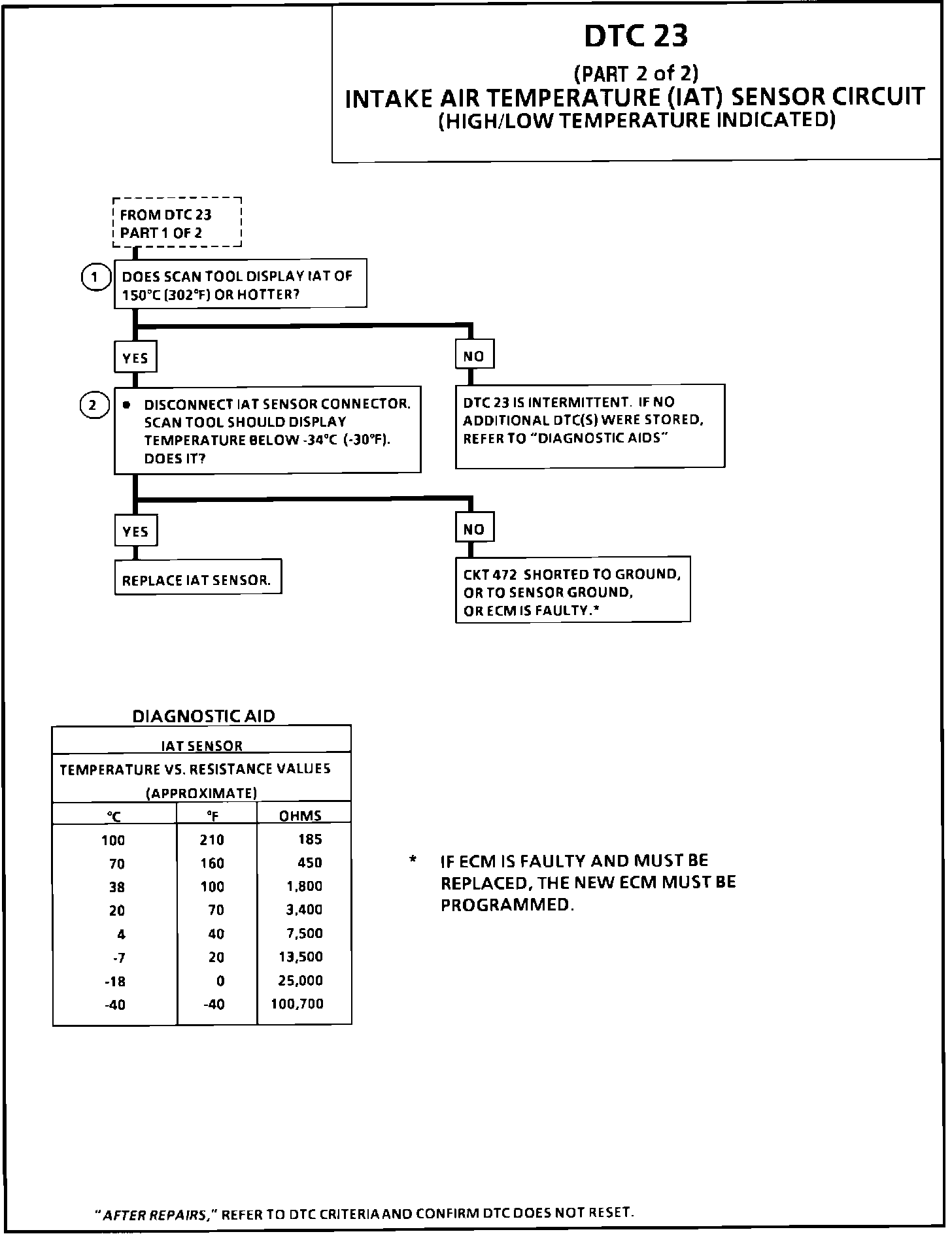 ^ If DTC 23 is intermittent or a "Hard Start" symptom is present, check intake air temperature with a scan tool on a cool engine. Temperature displayed should be within 5 degrees of the ambient. If not, check the IAT sensor using the "Diagnostic Aids" on the next part.