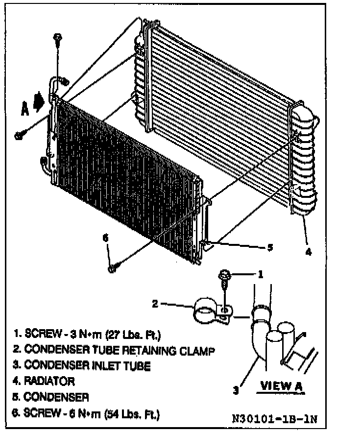 1. Condenser into position by tipping radiator toward engine.