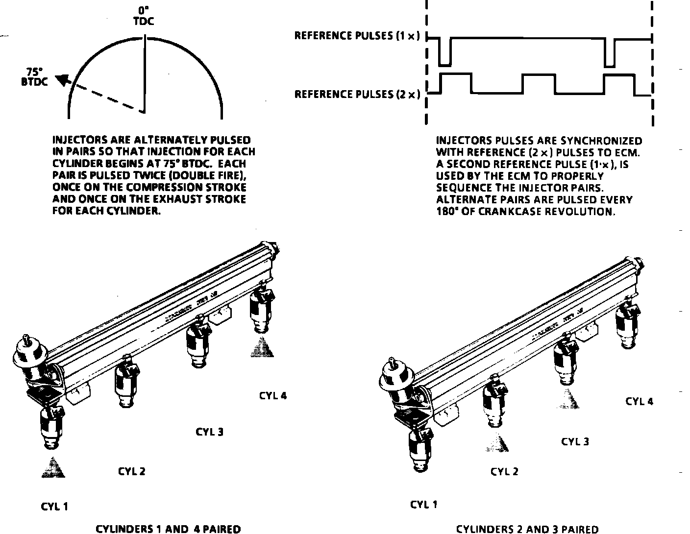 For better fuel vaporization and improved emission control, fuel is injected at the intake valves while they are in the closed position. To do this, the fuel injectors are alternately pulsed in pairs so that injection for each cylinder begins 75 degrees Before Top Dead Center (BTDC). Injectors for cylinders 1 and 4 are electrically paired, as are the injectors for cylinders 2 and 3. Each pair of injectors is pulsed twice (double fire), once on the compression stroke and once on the exhaust stroke for each cylinder. Injector pulses are synchronized with the ignition reference (2X) pulse to the ECM. A second signal, the 1X reference pulse, is used to sequence the injector pairs.
