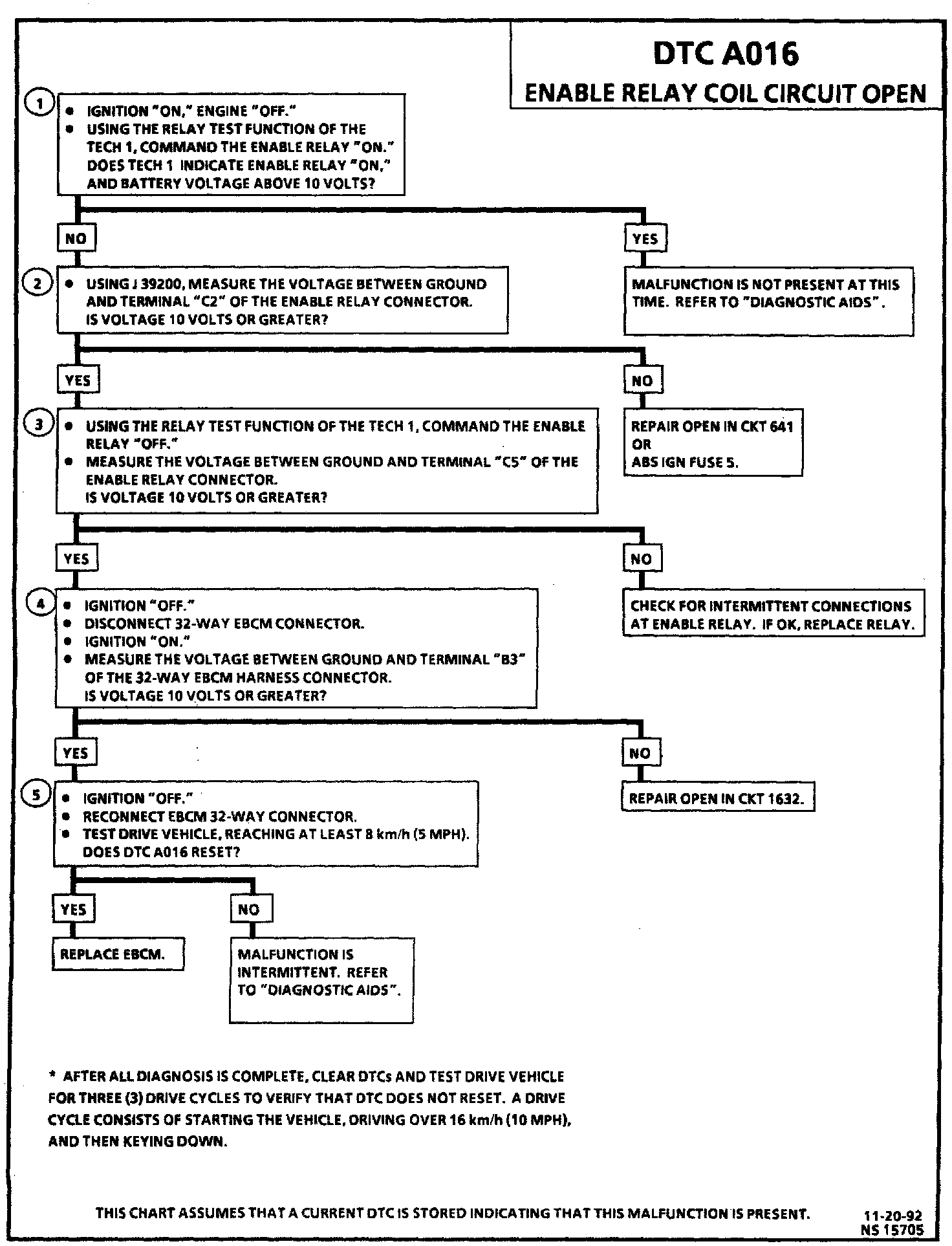 DTC A016 can be set only after DTC A014 has been set. This test detects an open in the enable relay coil circuit. An open in this circuit will not allow the enable relay to be energized thus preventing voltage/current to the motors and solenoids. If this malfunction is present and the ignition is turned "OFF" before 5 km/h (3 mph) is reached, DTC A014 is set alone.