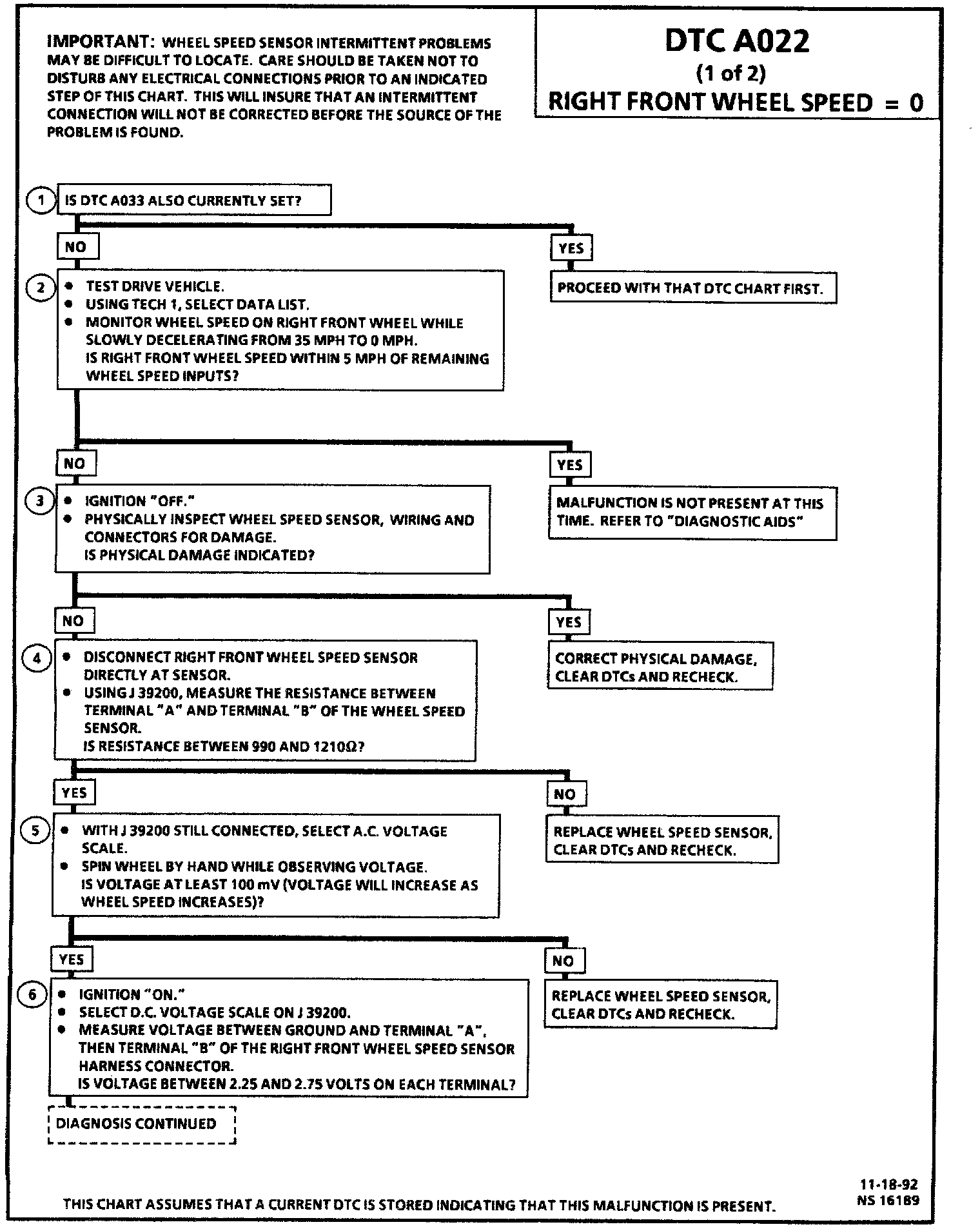 DTC A022 can be set when the vehicle is not in an ABS stop. If the right front wheel speed =0 and the vehicle's reference speed is greater than 8 km/h (5 mph), a malfunction exists.