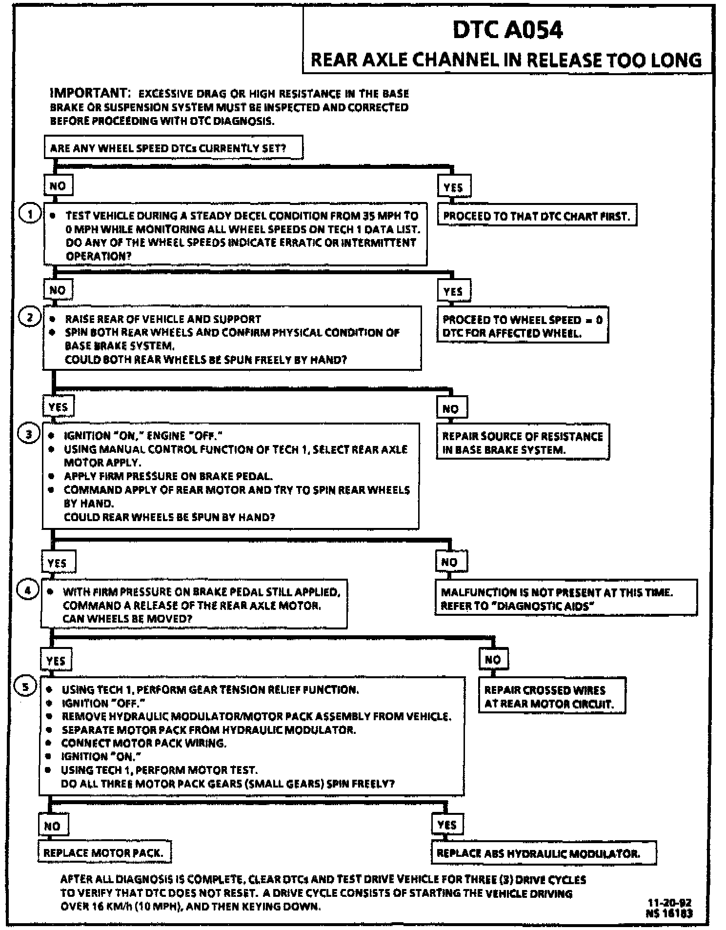 DTC A054 can be set only during an ABS stop. If the EBCM commands the rear axle channel in release for three seconds, a malfunction exists.