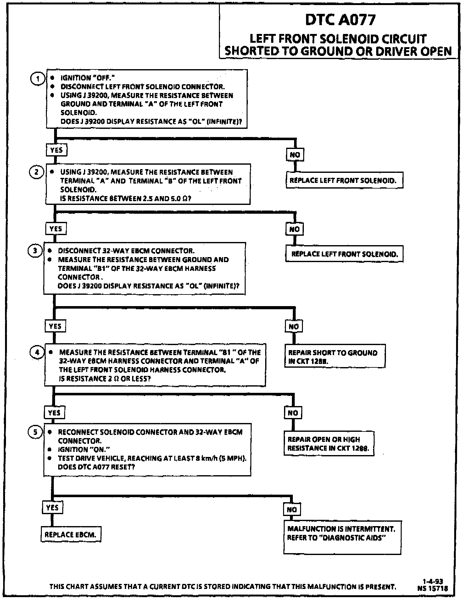DTC A077 can be set only when the solenoid is commanded "ON." If the EBCM detects the left front solenoid control circuit voltage is out of specification, a malfunction exists.