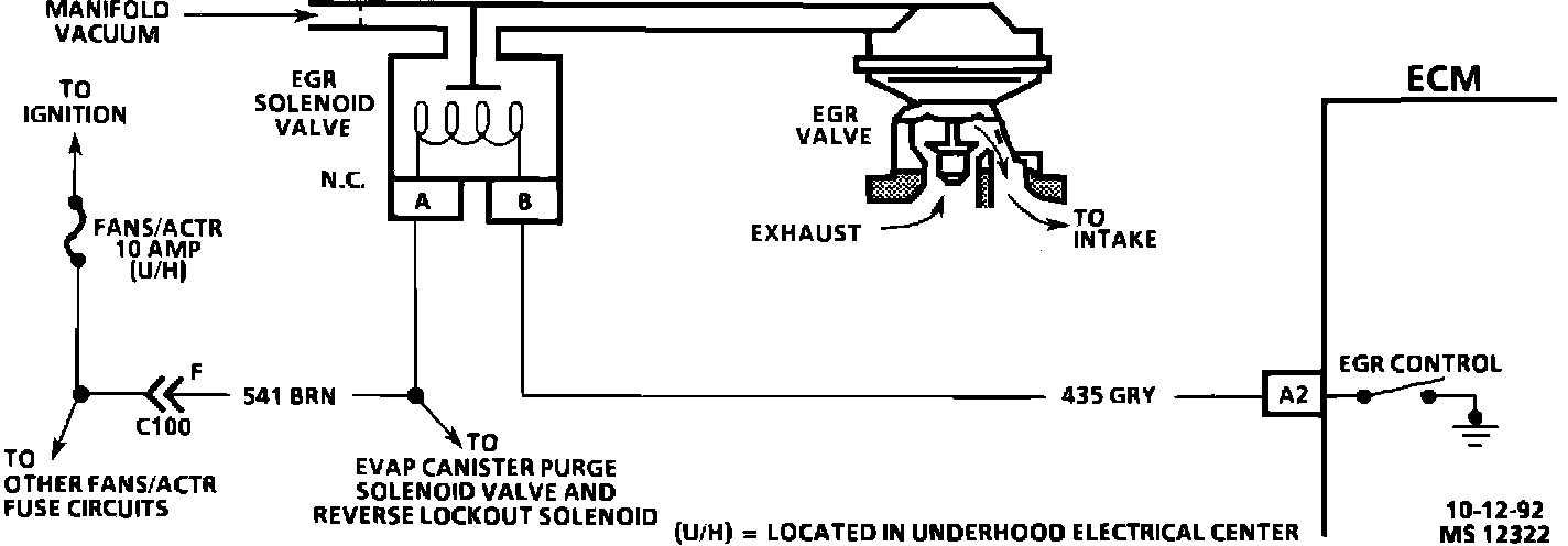 The Exhaust Gas Recirculation (EGR) valve vacuum is controlled by an ECM controlled solenoid valve. The ECM will turn the EGR "ON" and "OFF" (Duty Cycle) by grounding CKT 435. The duty cycle is calculated by the ECM based on information from the engine coolant temperature, air flow and engine RPM. There should be no EGR when in park or neutral, TP sensor input below a specified value, or TP sensor indicating Wide Open Throttle (WOT).