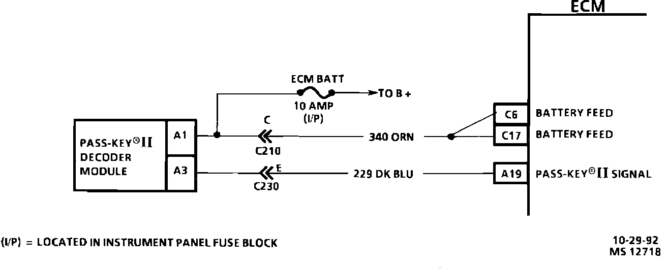The PASS-Key� II system is designed to disable vehicle operation if the incorrect key or starting procedure is used. The PASS-Key� II decoder module sends a signal to the ECM if the correct key is being used. If the proper signal does not reach the ECM on CKT 229, the ECM will not pulse the injectors "ON" and thus not allow the vehicle to be started.
