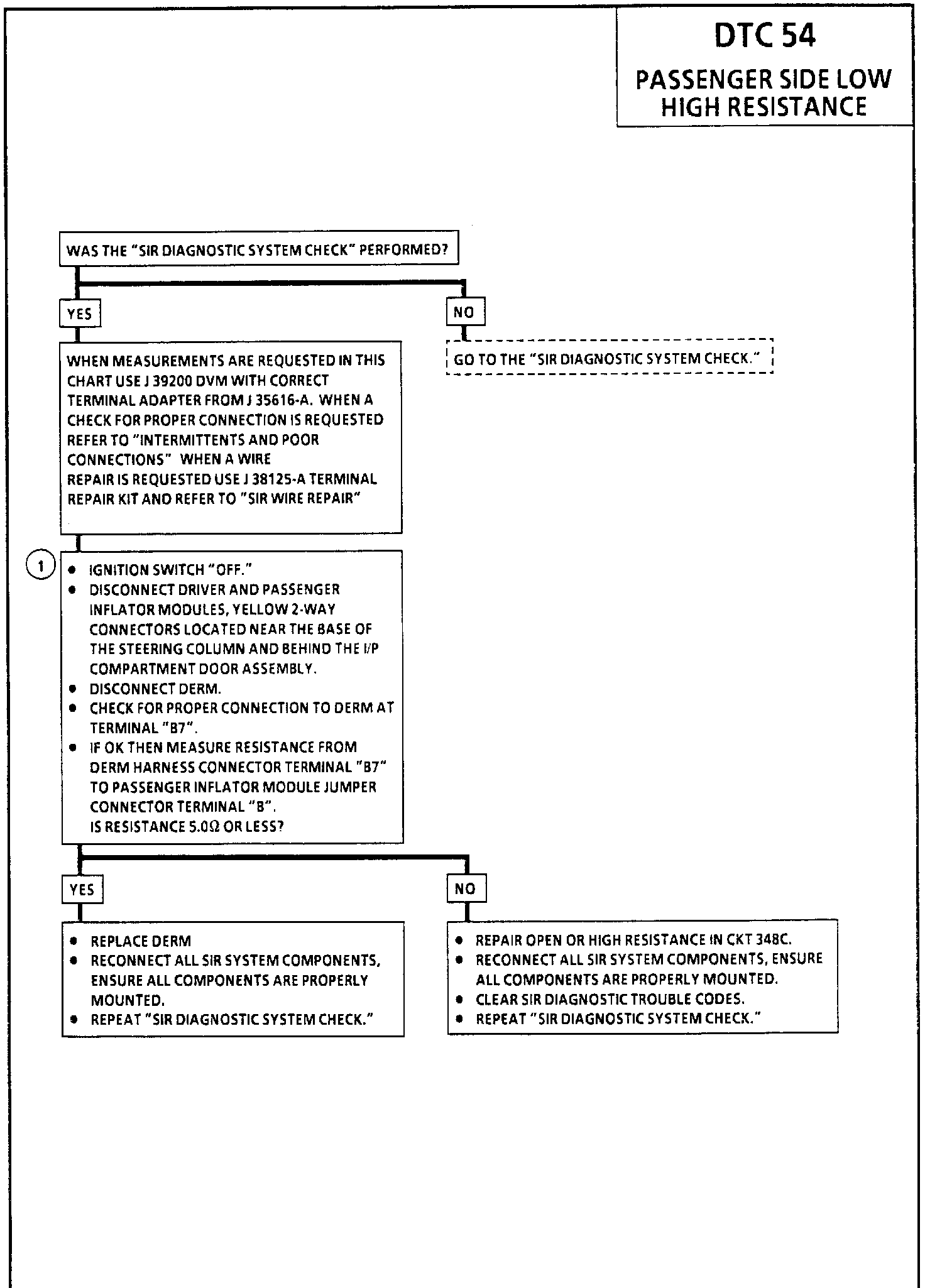 During the "Initiator Assembly Resistance Test" the DERM grounds the "Passenger Side Low" terminal "B7" and turns "ON" the driver current source at the "Driver Side High" terminal "B9." This causes a known amount of current to flow through the driver initiator circuit allowing the resistance to be calculated. The normal, non-deployment current flow through the passenger deployment loop is also affected since the DERM is supplying ground through a resistor bypassing the ground supplied by the resistance of the discriminating sensor network. When the voltage difference between "Passenger Side High" terminal "A7" and "Passenger Side Low" terminal "B7" is above a specified value DTC 54 is set.