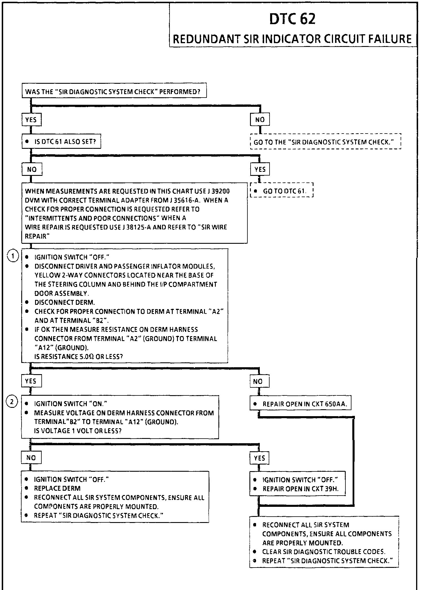 When the ignition switch is first turned "ON" battery voltage is applied to the "AIR BAG" warning lamp and to the "Ignition 1" input terminals "A9" and "A10." The DERM responds by flashing the "AIR BAG" warning lamp seven times alternating between the primary and redundant lamp drivers The DERM monitors the redundant lamp driver output by comparing the output state at "SIR Indicator" terminal "B1" to the microprocessor commanded state When "Ignition 1" is above a specified value and the output state does not match the commanded state of the redundant lamp driver for 400 milliseconds DTC 62 is set.