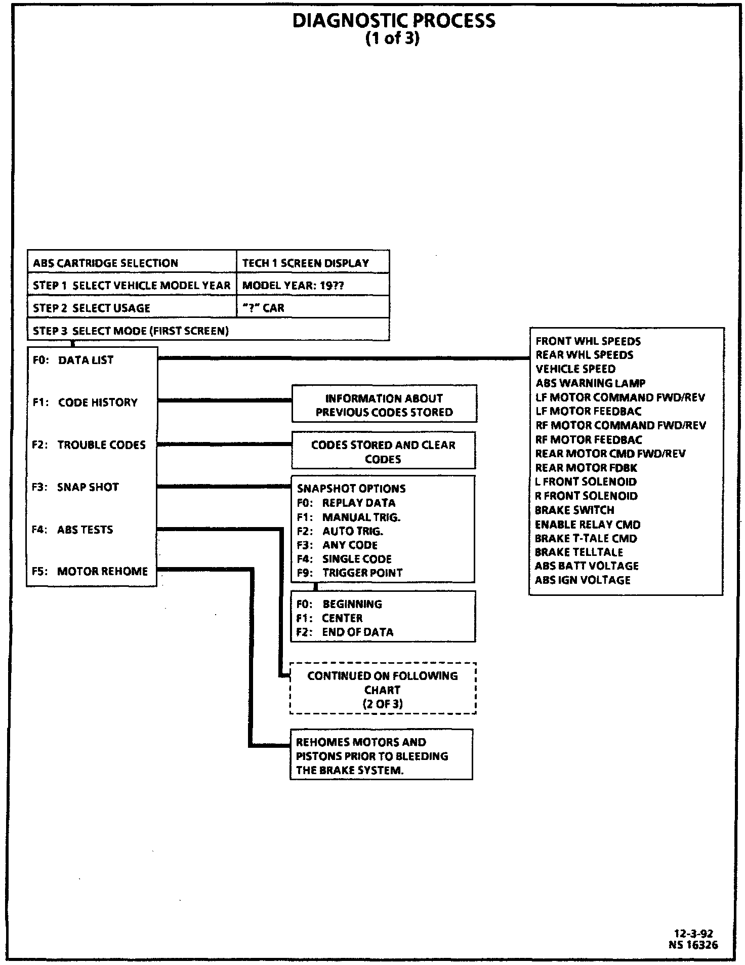 1. Using the Tech 1 scan tool, read all current and history diagnostic trouble codes (F2). Be certain to note which codes are current malfunctions. DO NOT CLEAR CODES unless directed to do so.