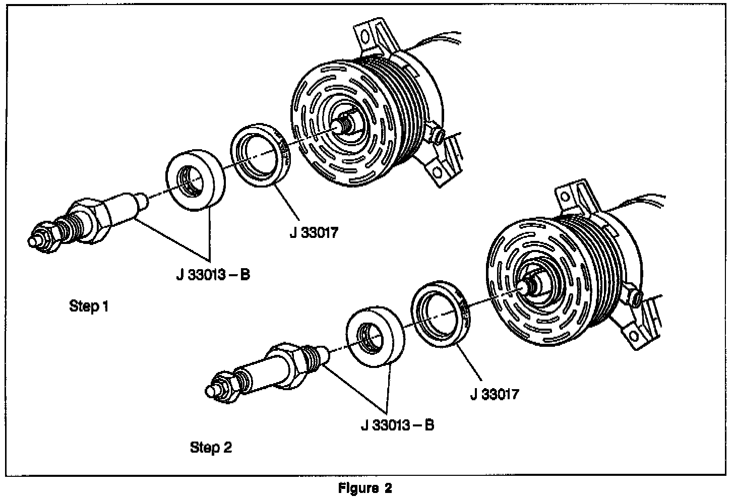 To correct this condition install the following parts. (See Figure 1 for part locations.) When installing the A/C compressor pulley use special tool J 33013B, and J 33017. (See Figure 2 tool orientation.)
