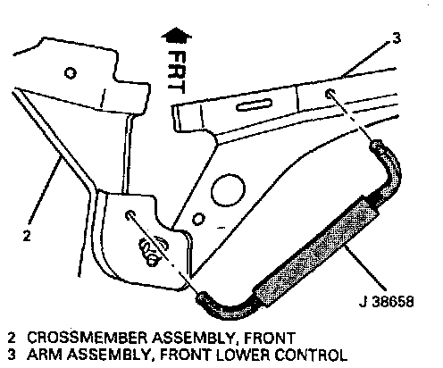 2. Loosen front lower control arm nuts, then install camber/caster adjuster J 38658 to slot holes in lower control arm and front crossmember, Fig. 3.
