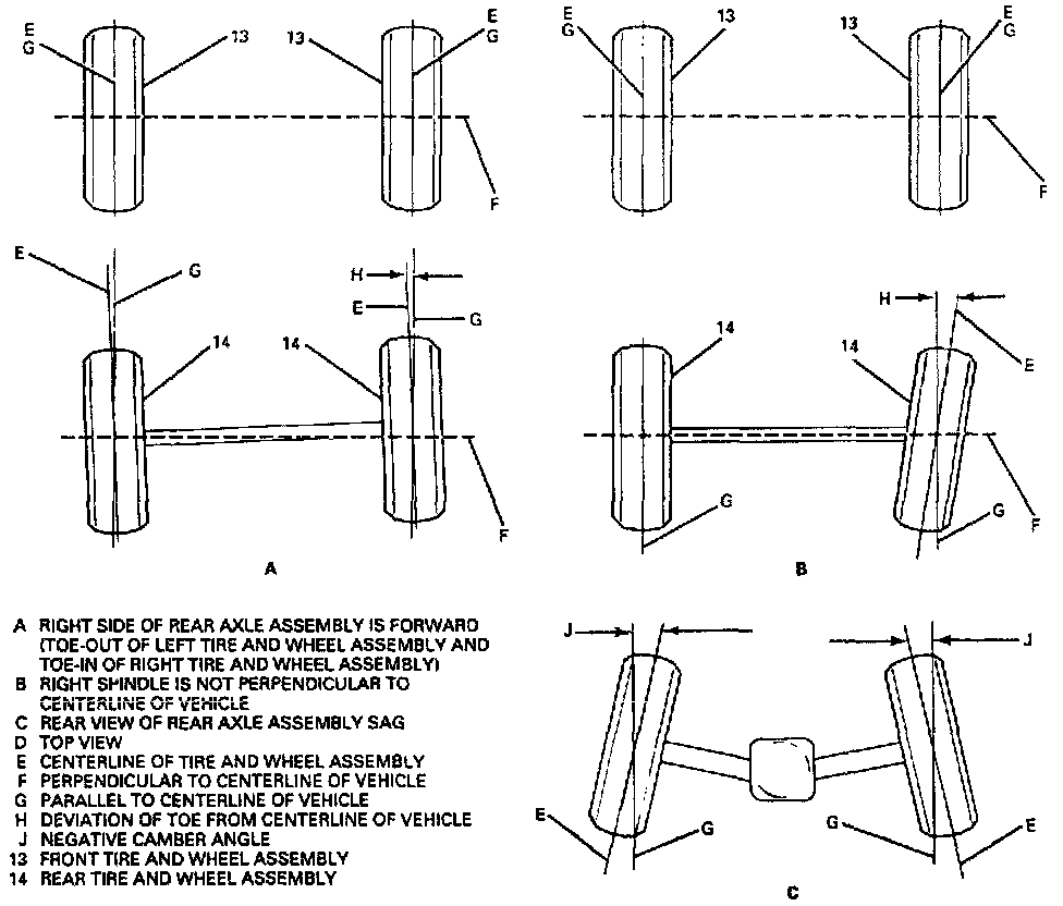 After front wheel alignment has been checked or adjusted, rear wheel alignment angles should be checked if vehicle still does not track properly or if excessive rear tire wear is present. Rear wheels should be parallel to and the same distance from the vehicle centerline, Fig. 9.
