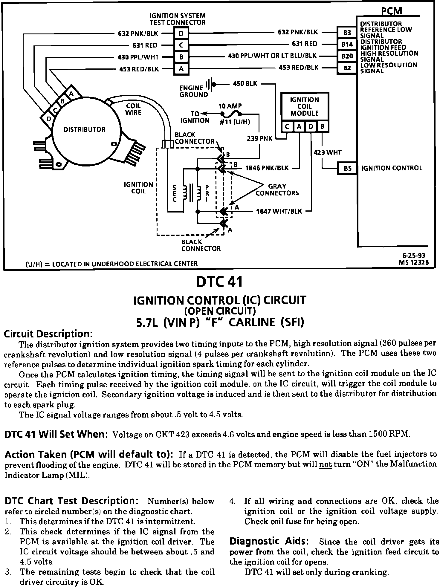 Use the revised DTC 41 chart and facing page provided in place of the DTC 41 chart and facing page in this service manual. The DTC 41 facing page art (MS 12328) shows both possible wire colors for the High Resolution circuit (CKT 430). Refer to the art provided when performing any ignition system diagnosis in this manual.