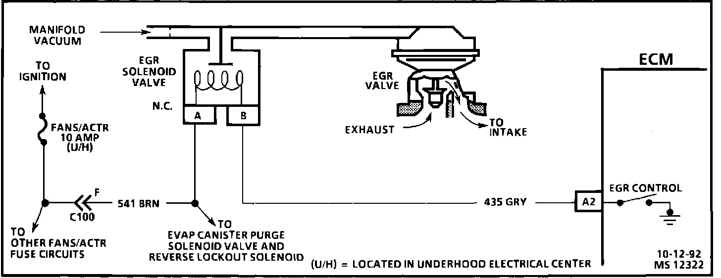 The Exhaust Gas Recirculation (EGR) valve is controlled by a normally closed solenoid valve. The ECM turns the solenoid valve "ON" to allow vacuum to pass to the EGR, and turns the solenoid valve "OFF" to prevent EGR operation.