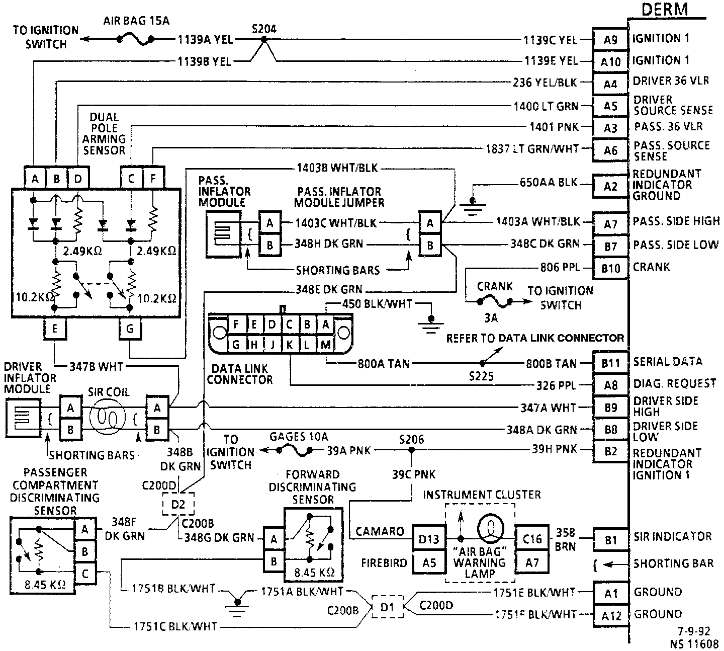 When the DERM recognizes "Ignition 1" voltage, applied to terminal "A9" and "A10," is in the normal operating voltage range the "AIR BAG" warning lamp is flashed 7 times to verify operation and serial data communication is enabled. At this time the DERM performs "Turn-On" tests followed by "Continuous Monitoring" tests. When no malfunctions are detected the DERM proceeds to the "Initiator Assembly Resistance Test." When a malfunction is detected the DERM sets a current diagnostic trouble code and illuminates the "AIR BAG" warning lamp. The DERM will clear current diagnostic trouble codes and move them to a history file when the malfunction is no longer detected and/or the ignition switch is cycled, except for DTC 51. DTC 51 can only be cleared using a scan tool "Clear Codes" command.