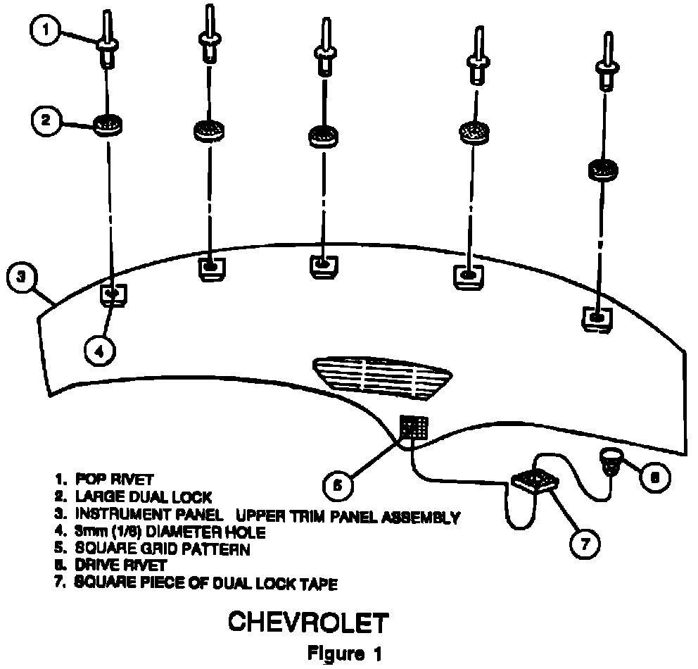 C. At Location # 5 (See Figure 1), DO NOT use the round rivet retained fastener. Use dual lock tape supplied in Idt, cut tape to fit area at Location #5. Pierce a small hole through the center of the tape and insert a drive rivet, P/N 16754493, through the tape. Remove tape backing and install. Using a small punch and hammer push drive rivet into grid at location # 5.
