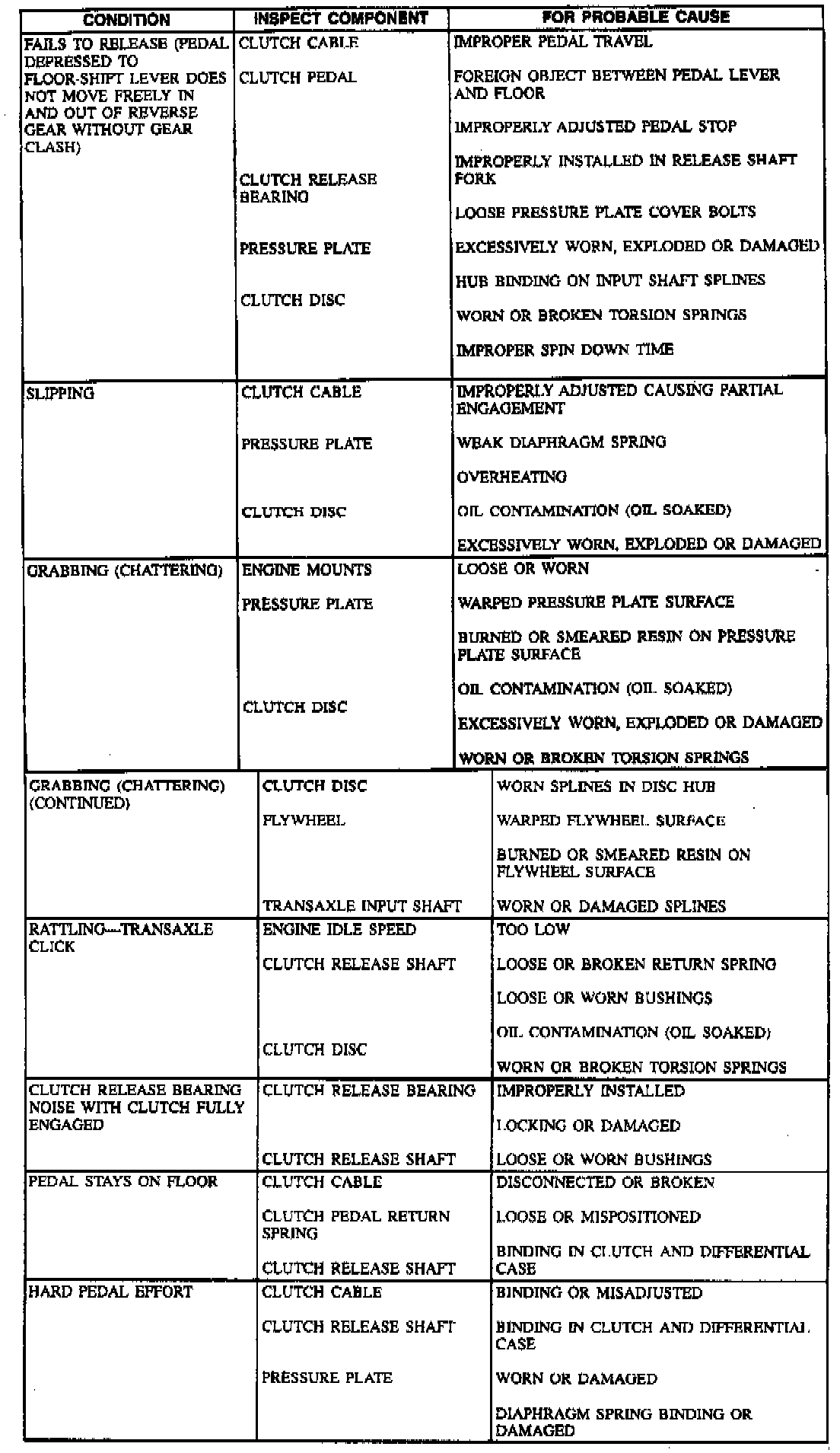 A Symptom Chart - Cable Operated Clutch