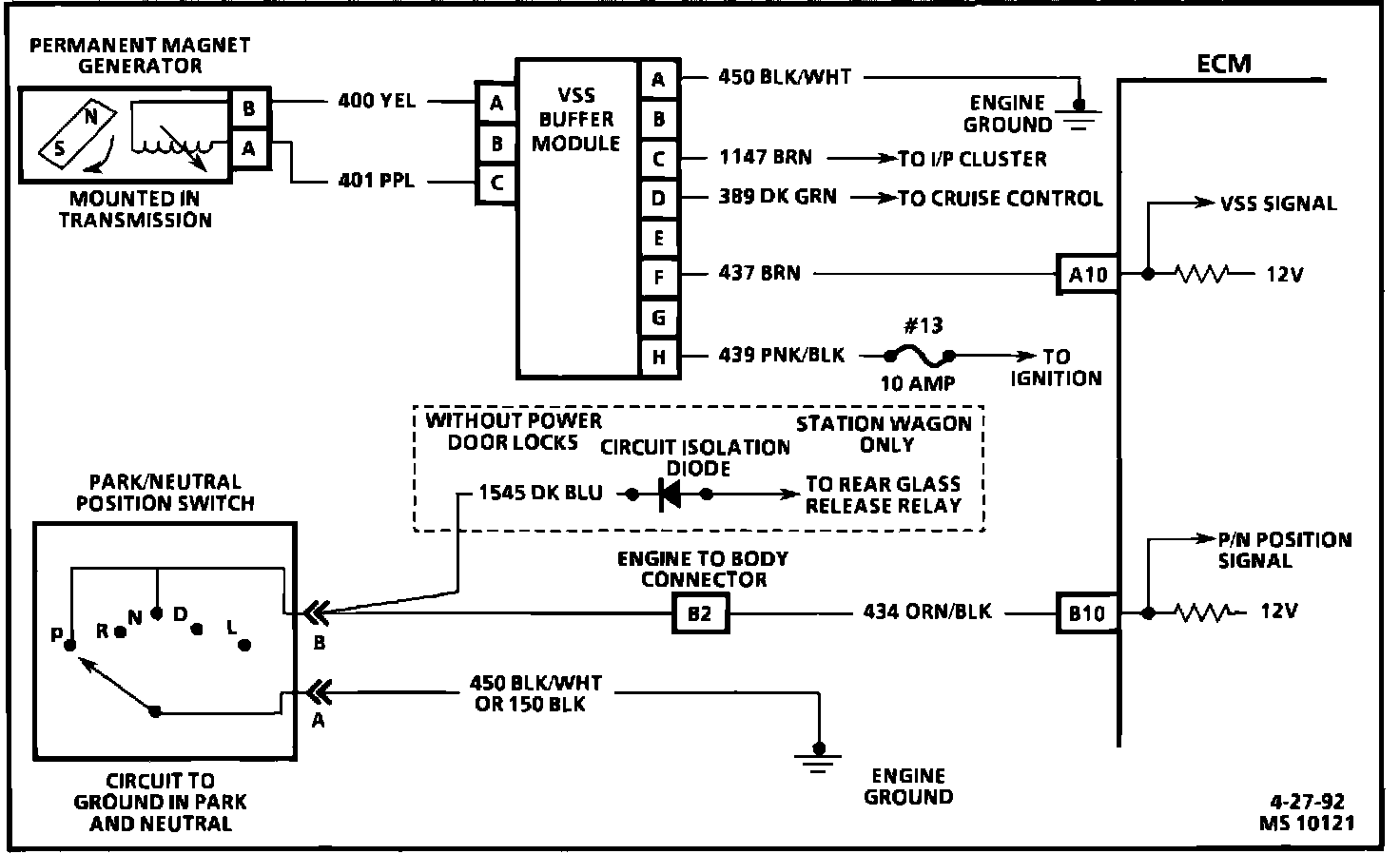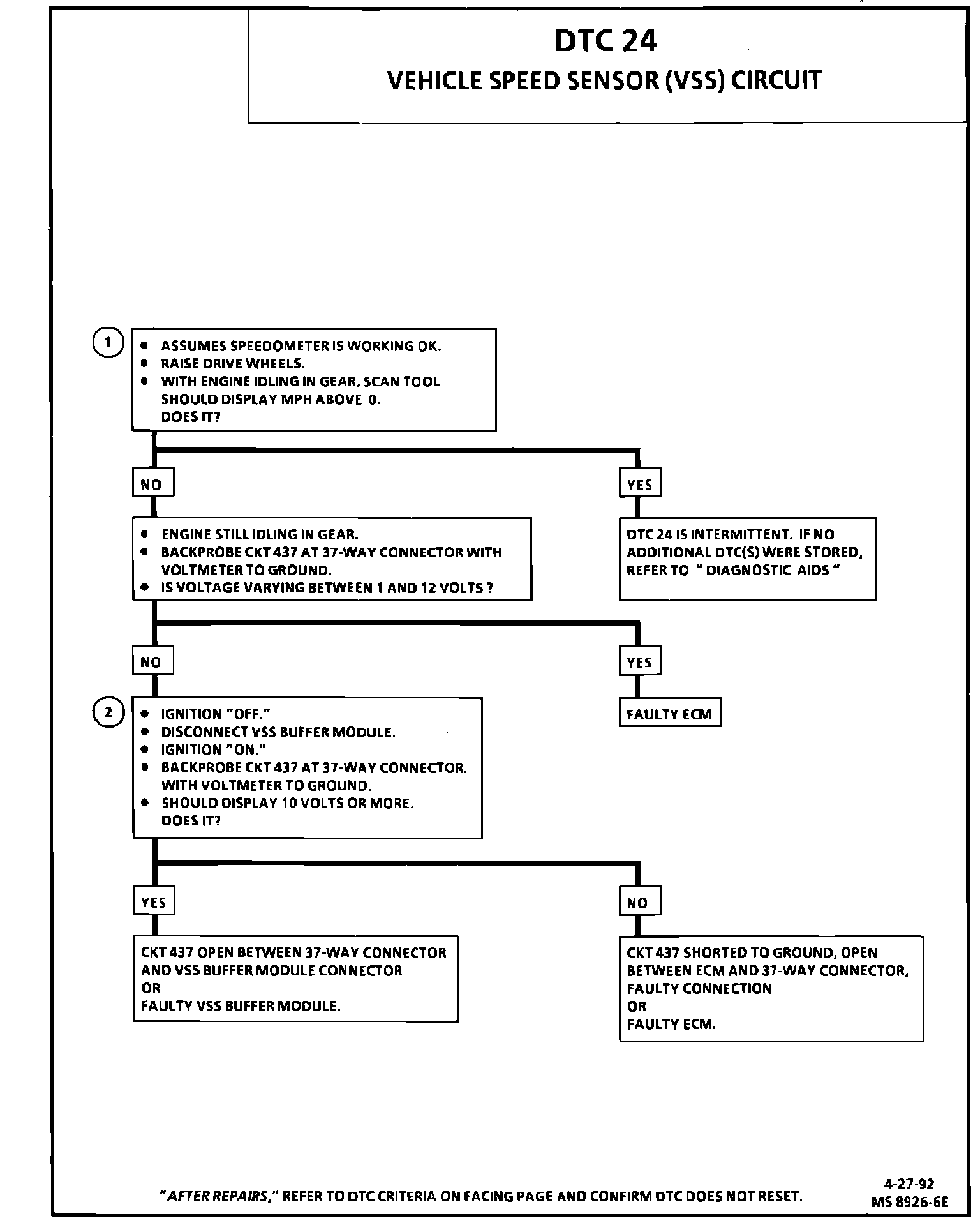 2. 8.0-12.0 volts, at the connector, indicates that circuit 437 is open between the connector and the Vehicle Speed Sensor (VSS) buffer, or there is a faulty vehicle speed sensor. A voltage of less than 1.0 volt, at the connector, indicates that the wire in circuit 437 is shorted to ground. If after disconnecting circuit 437 at the VSS buffer, the voltage reads above 10.0 volts, the VSS is faulty. If voltage remains less than 8.0 volts, then circuit 437 is grounded. If circuit 437 is not grounded, there is a faulty ECM connection, open at the ECM, or a faulty ECM.