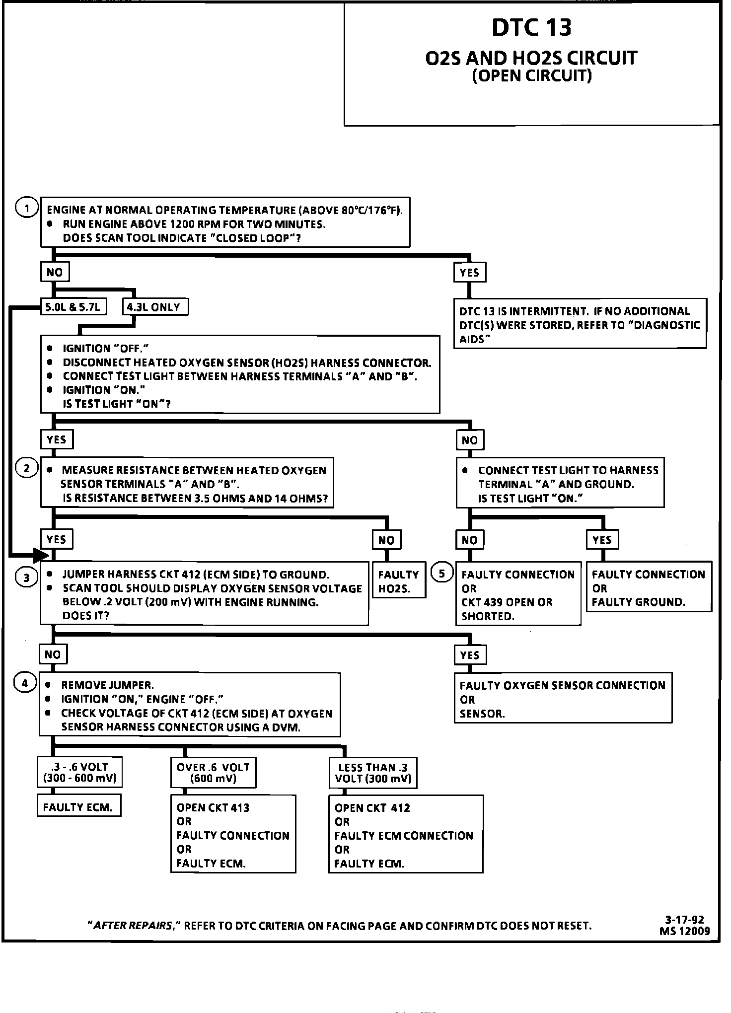 Normal scan tool voltage varies between 10 mV to 1000 mV (0.01 and 1.0 volt), while in "Closed Loop." DTC 13 sets in one minute if voltage remains between 0.35 and 0.55 volt, however the system will go "Open Loop" in about 15 seconds.