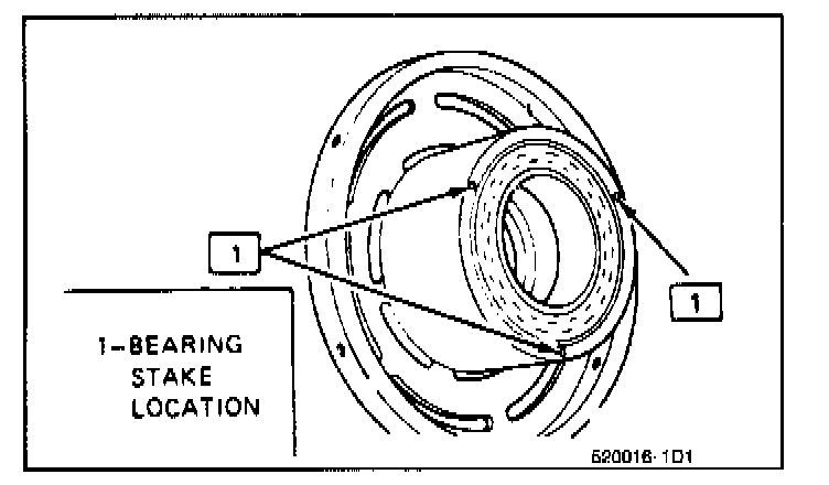 3. Using a center punch with a 45° angle point. stake 1.1-1.4mm (0.045-055" deep) the bearing in three places 120° apart, but do not stake too deeply to avoid distorting the outer race of the bearing.