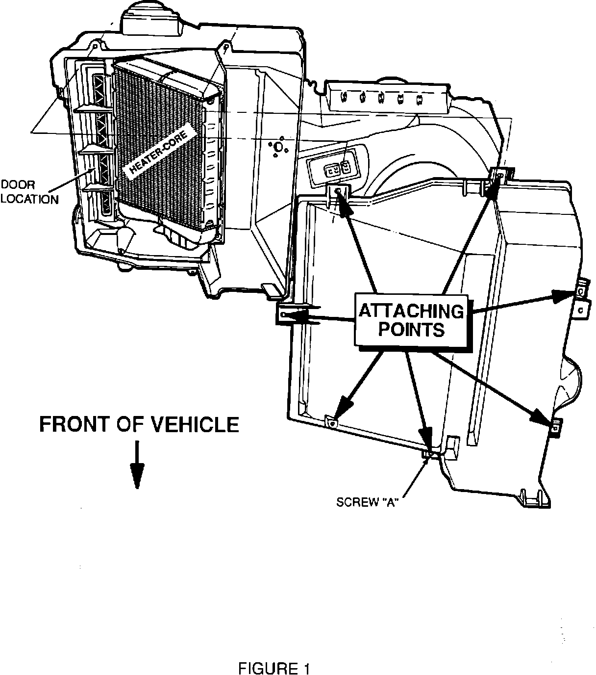 1. Remove A/C Module Lower Evaporator Case per Service Manual, Section 1B1. Front screw "A" may be hidden by carpet and difficult to access. Use of a 7 mm flex head socket may be helpful. (See Figure 1 for attaching points).