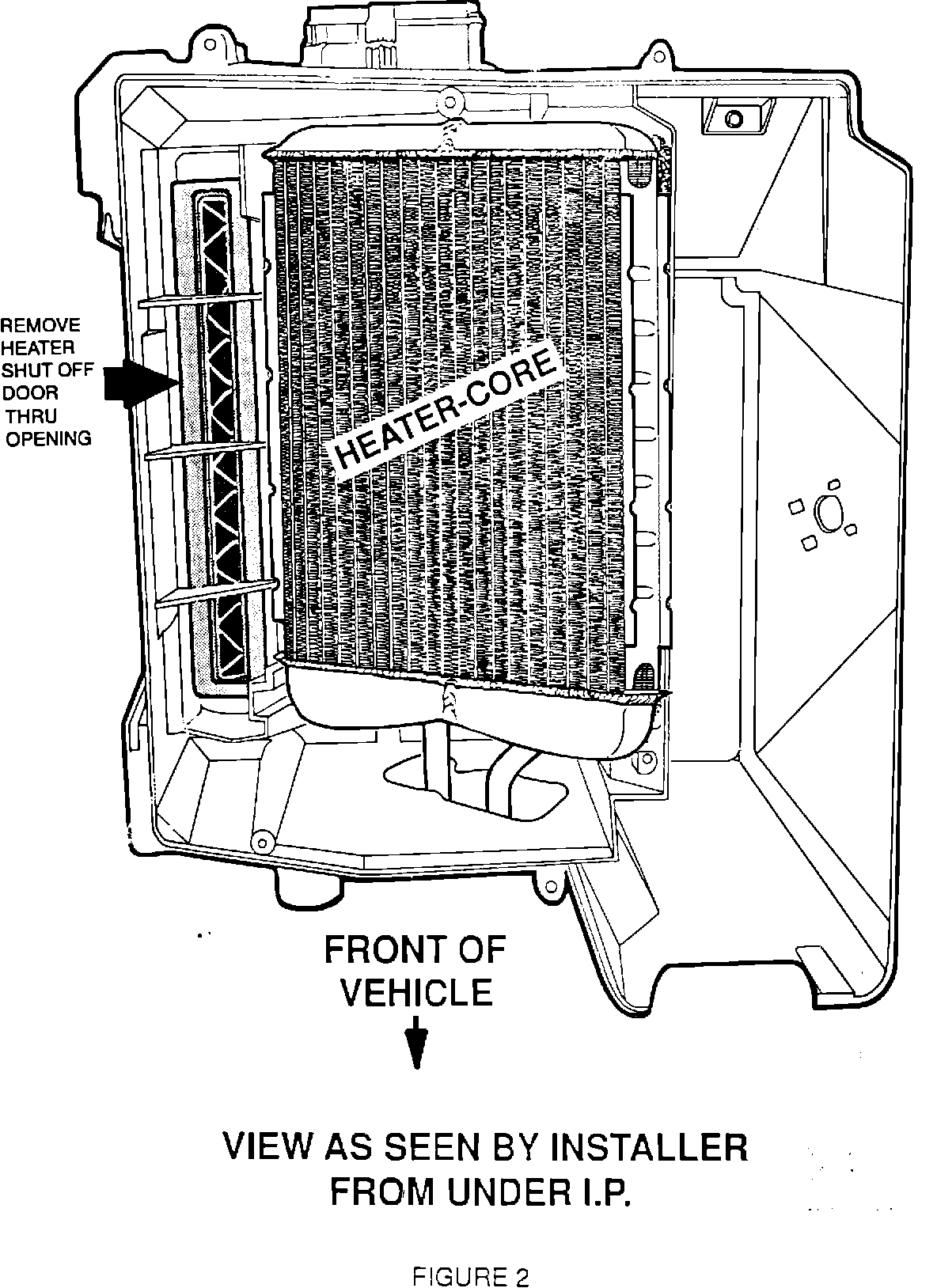 5. Remove heater shut off door by reaching through case opening and pushing the broken end of the door into the heater case cavity. Rotate the door while removing it through case opening.