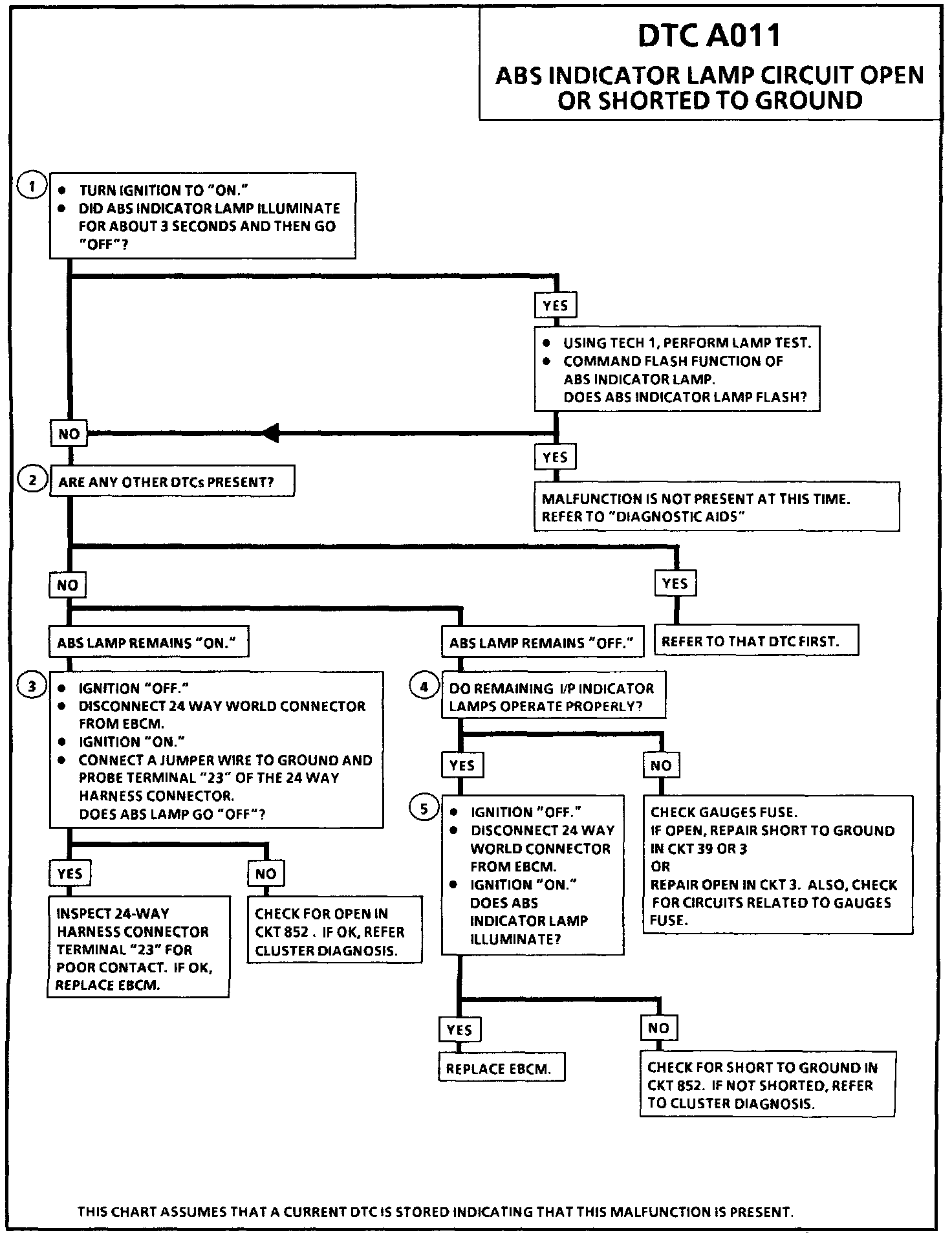 DTC A011 can be set only during the three second bulb check or when the ABS indicator lamp is commanded "ON." If the EBCM can not control the ABS indicator lamp for two seconds, a malfunction exists.