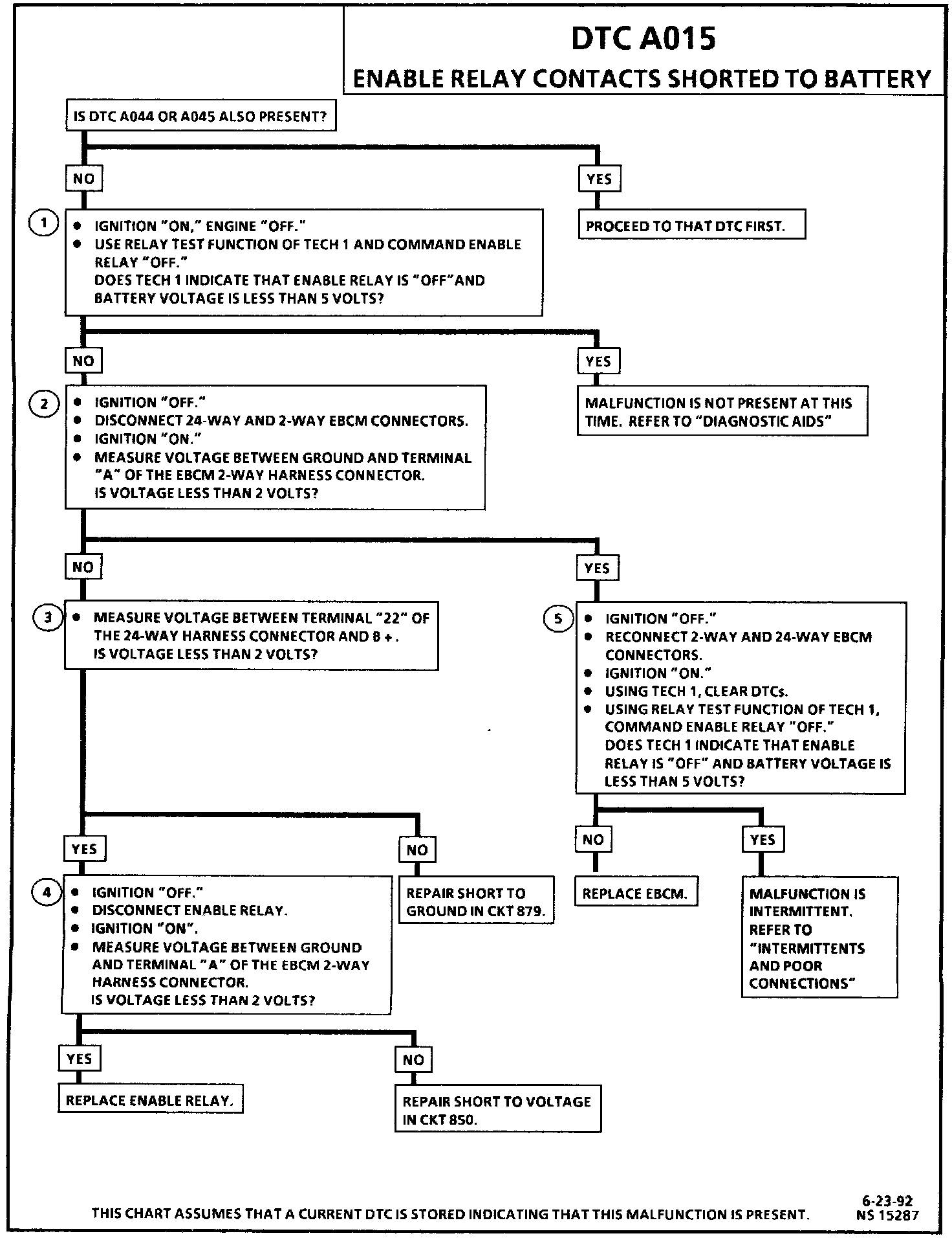 DTC A015 can be set only before the EBCM commands the relay "ON." This test determines if the enable relay is energized when it should not be. This malfunction would not allow the enable relay to remove power to the ABS system. If a second malfunction were to occur that requires the enable relay to be turned "OFF," that malfunction can not be removed if the relay can not be controlled. The malfunction must be present for three consecutive drive cycles before the DTC is set.