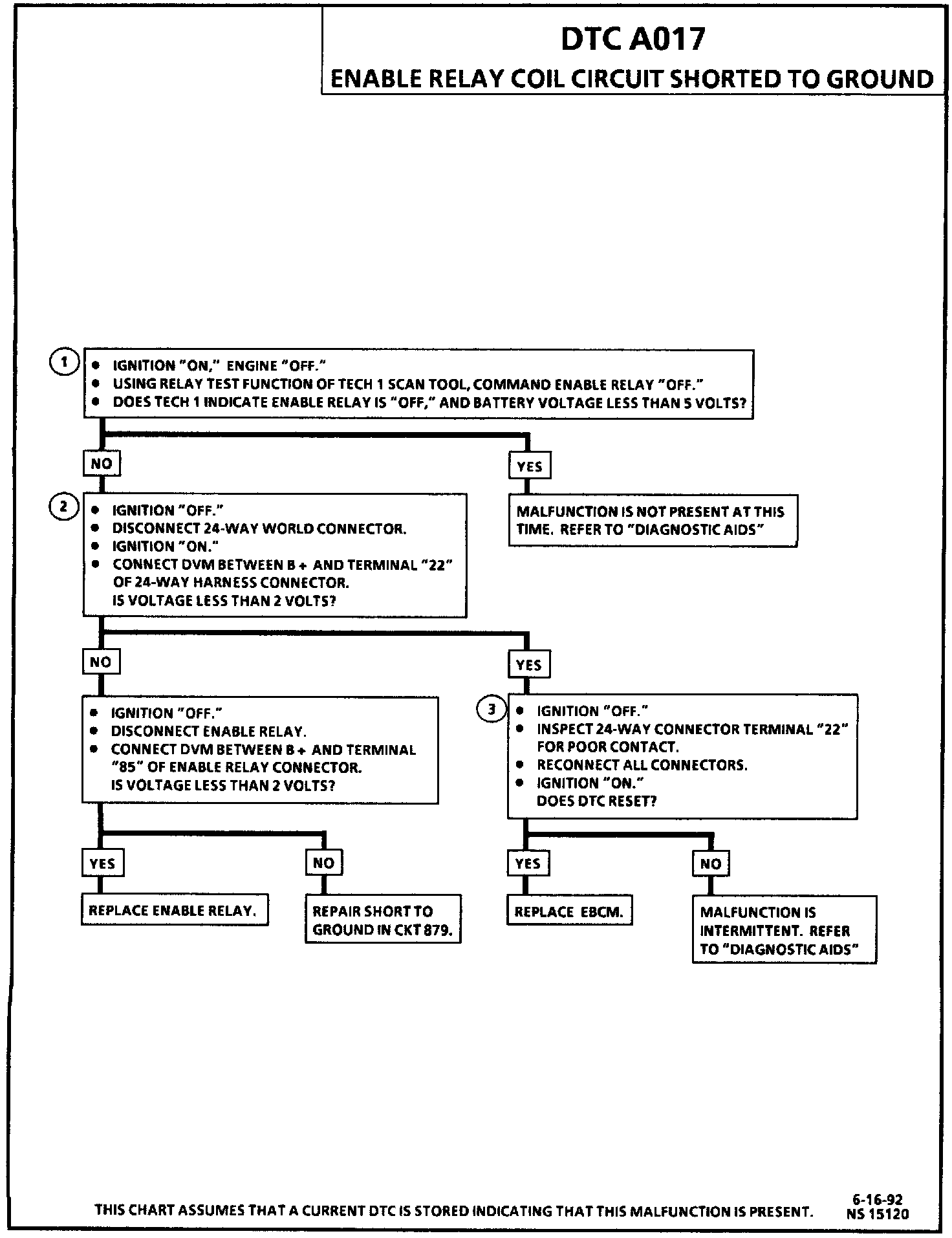 DTC A017 can be set before the EBCM commands the enable relay "ON." This test determines if the enable relay is energized when it should not be. This malfunction would not allow the enable relay to remove power to the ABS system. If a second malfunction were to occur that requires the enable relay to be turned "OFF," that malfunction can not be removed if the relay can not be controlled.