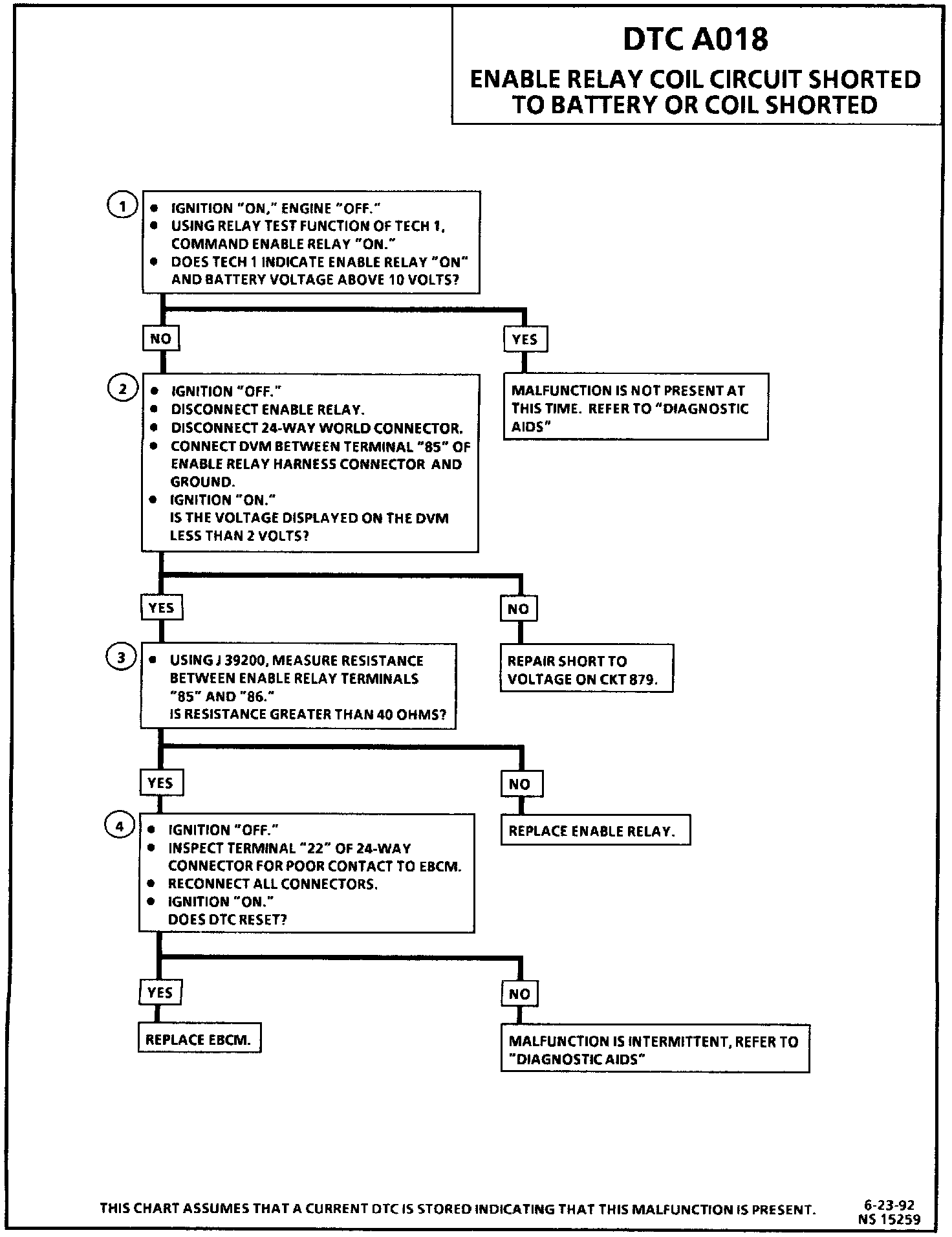 DTC A018 can be set after the EBCM commands the enable relay "ON." This test monitors the availability of current/voltage to the motors, solenoids and EMBs. A malfunction of this type will not allow voltage to be available to the motors, solenoids and EMBs; therefore, ABS operation would not be allowed if required.