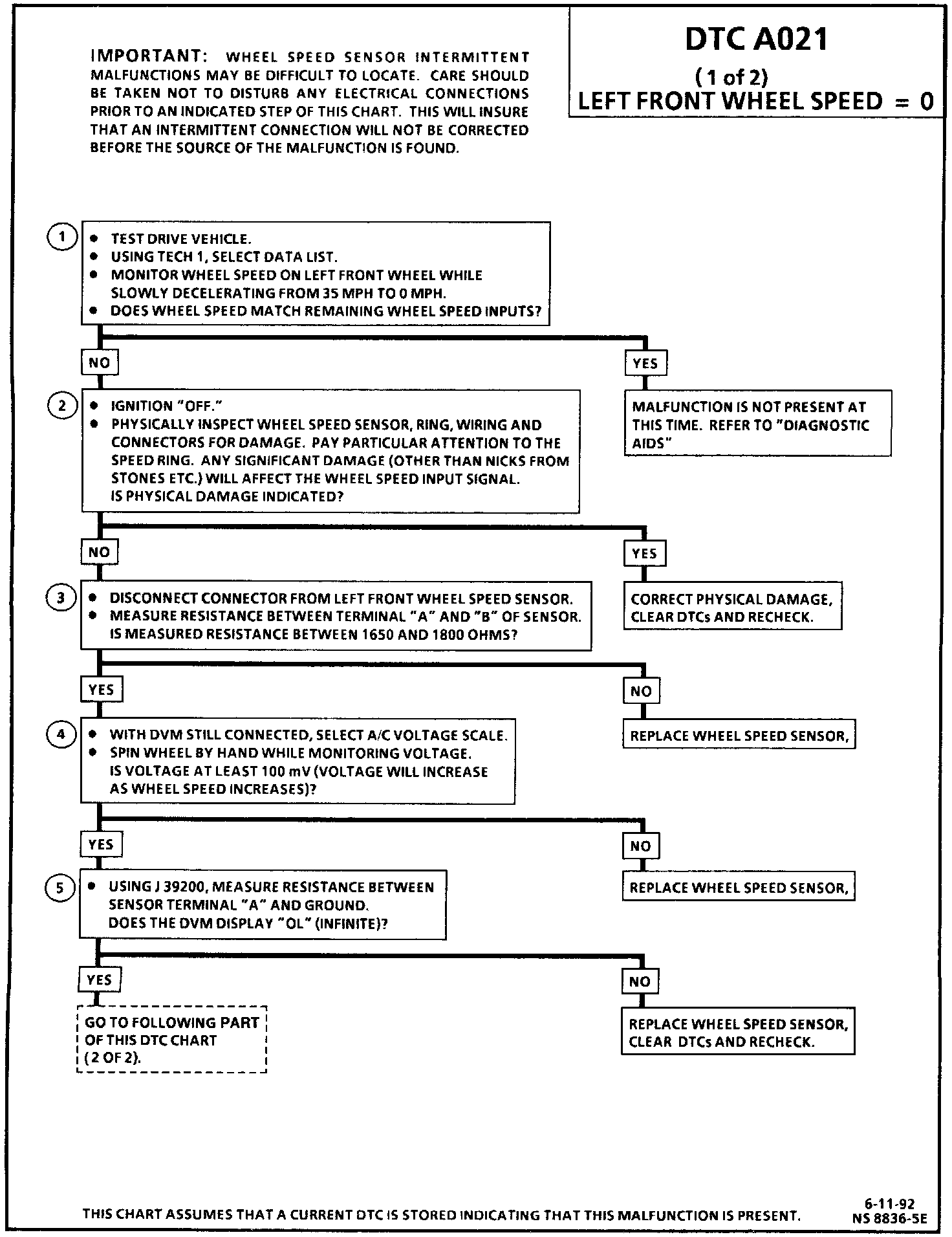 DTC A021 can be set when the vehicle is not in an ABS stop. If the left front wheel speed is less than 1/2 of the vehicle's reference speed and the vehicle's reference speed is greater than 8 km/h (5 mph), a malfunction exists.
