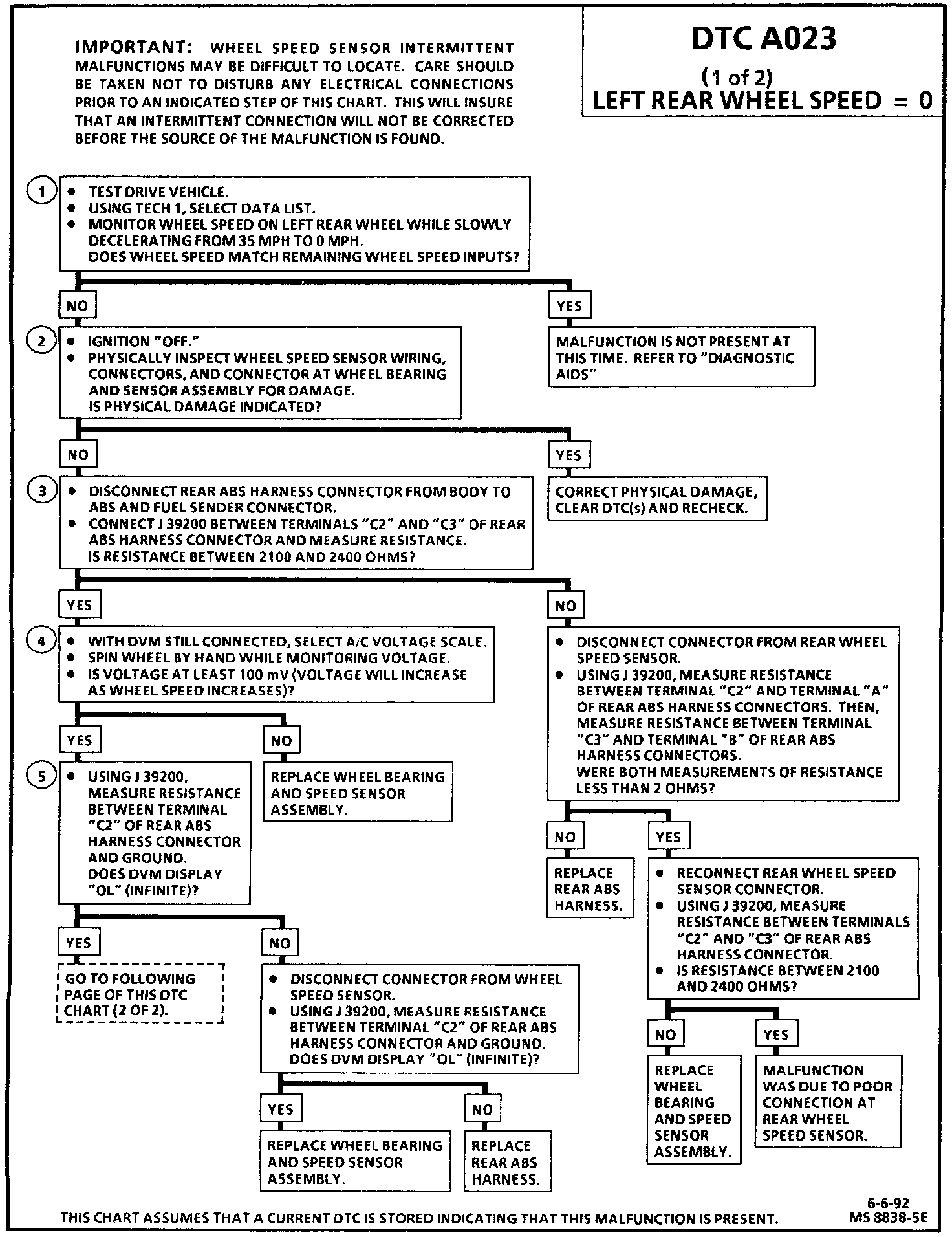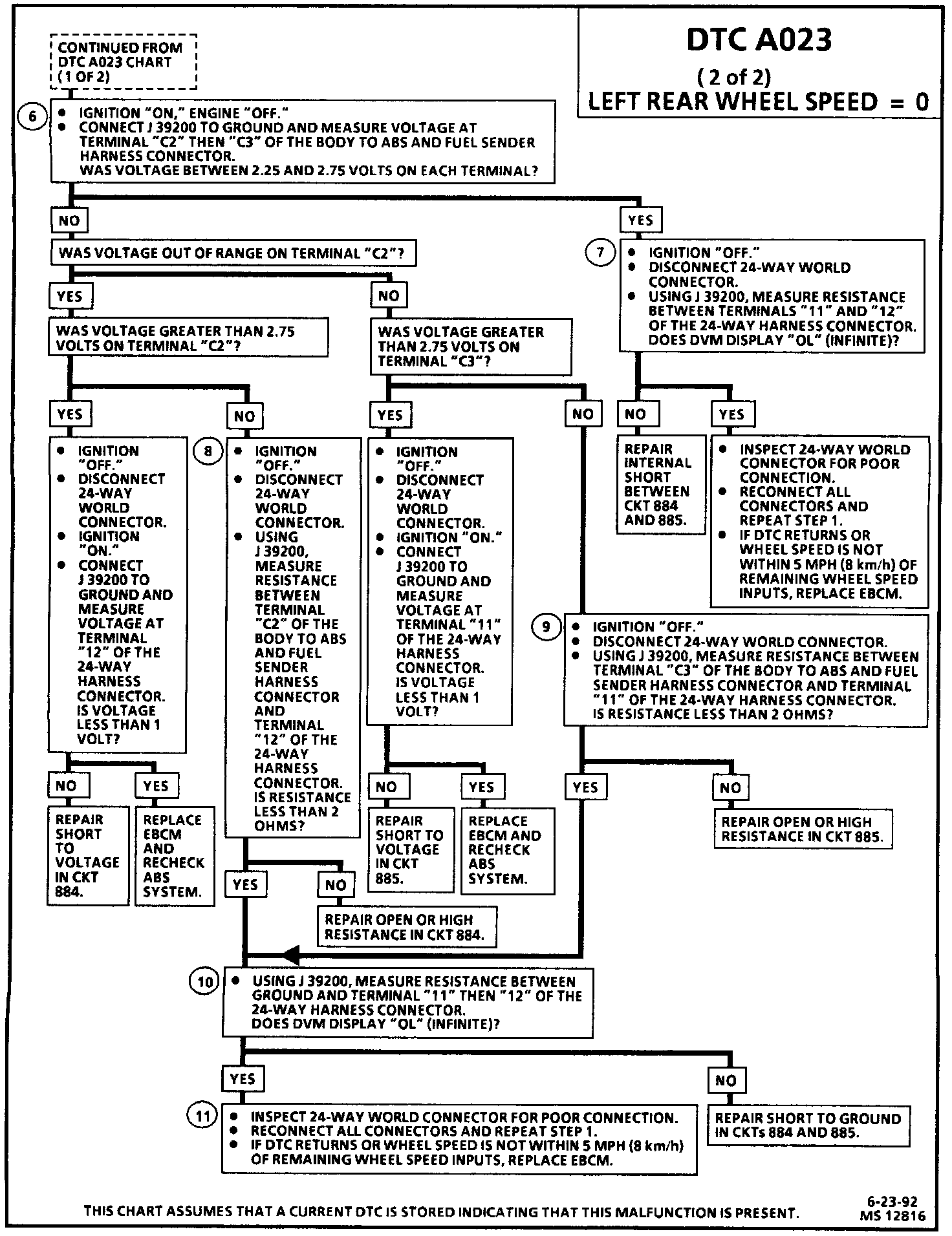 DTC A023 can be set when the vehicle is not in an ABS stop. If the left rear wheel speed is less than 1/2 of the vehicle's reference speed and the vehicle's reference speed is greater than 8 km/h (5 mph), a malfunction exists.