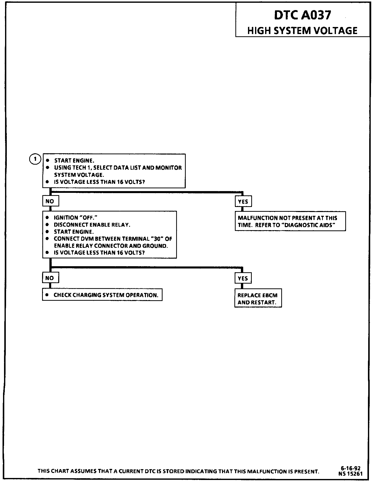 DTC A037 can only be set if the vehicle's speed is greater than 5 km/h (3 mph). If the switched battery voltage is greater than 17 volts, a malfunction exists.