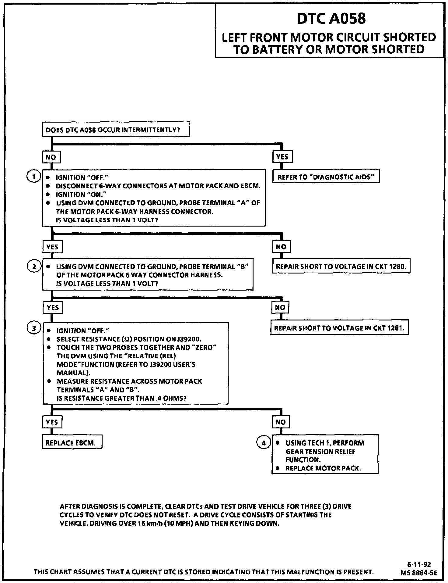 DTC A058 can be set anytime. If the EBCM detects an out of range voltage in either of the left front motor circuits indicating a circuit shorted to battery or a motor shorted, a malfunction exists.