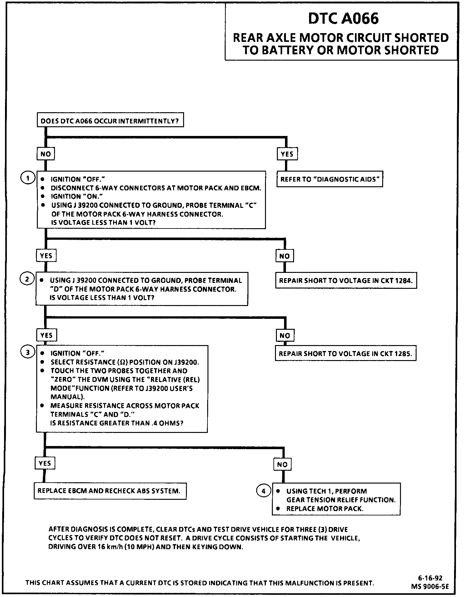 DTC A066 can be set anytime. If the EBCM detects an out of range voltage in either of the rear axle motor circuits indicating a circuit shorted to battery or a motor shorted, a malfunction exists.